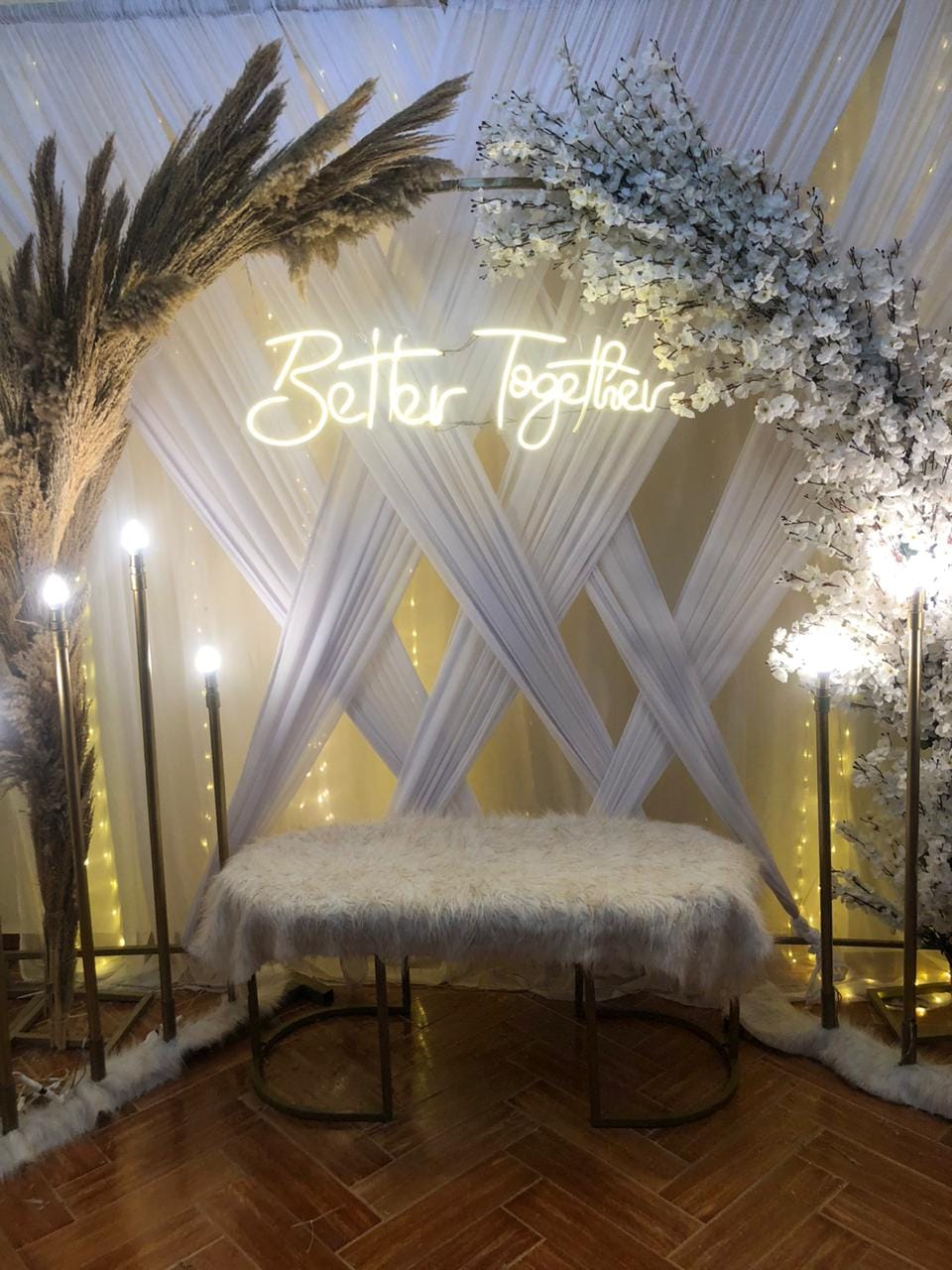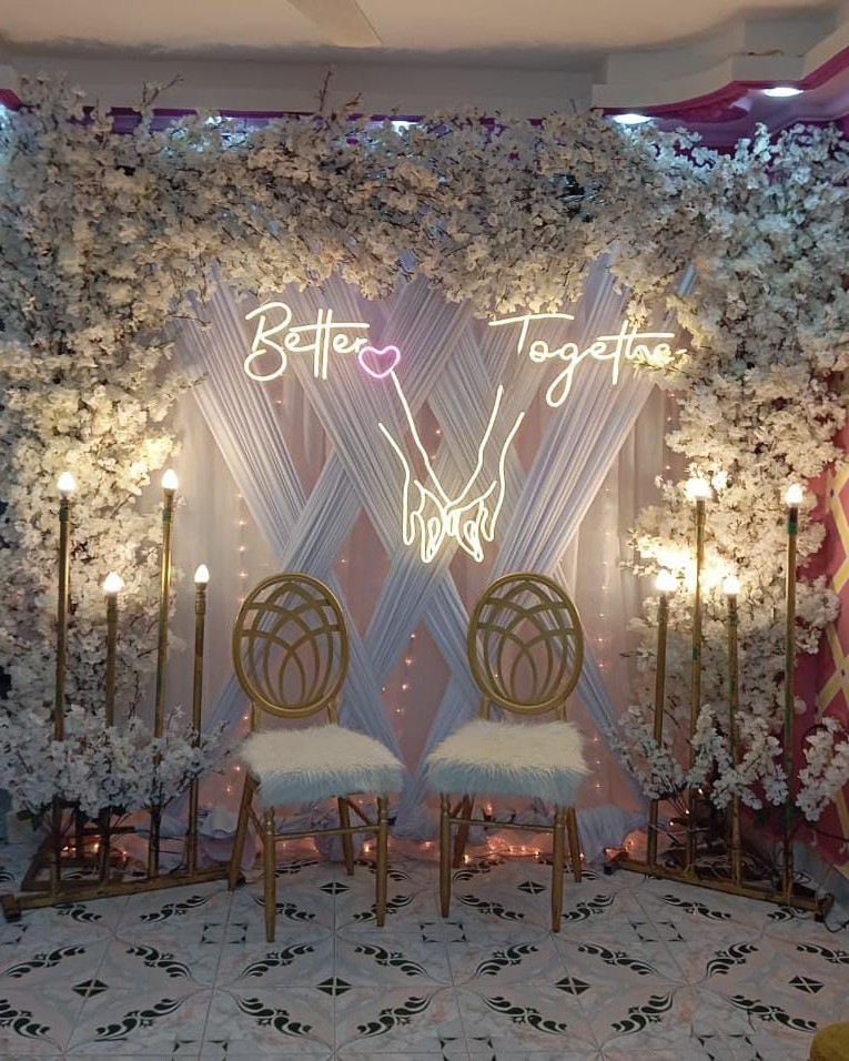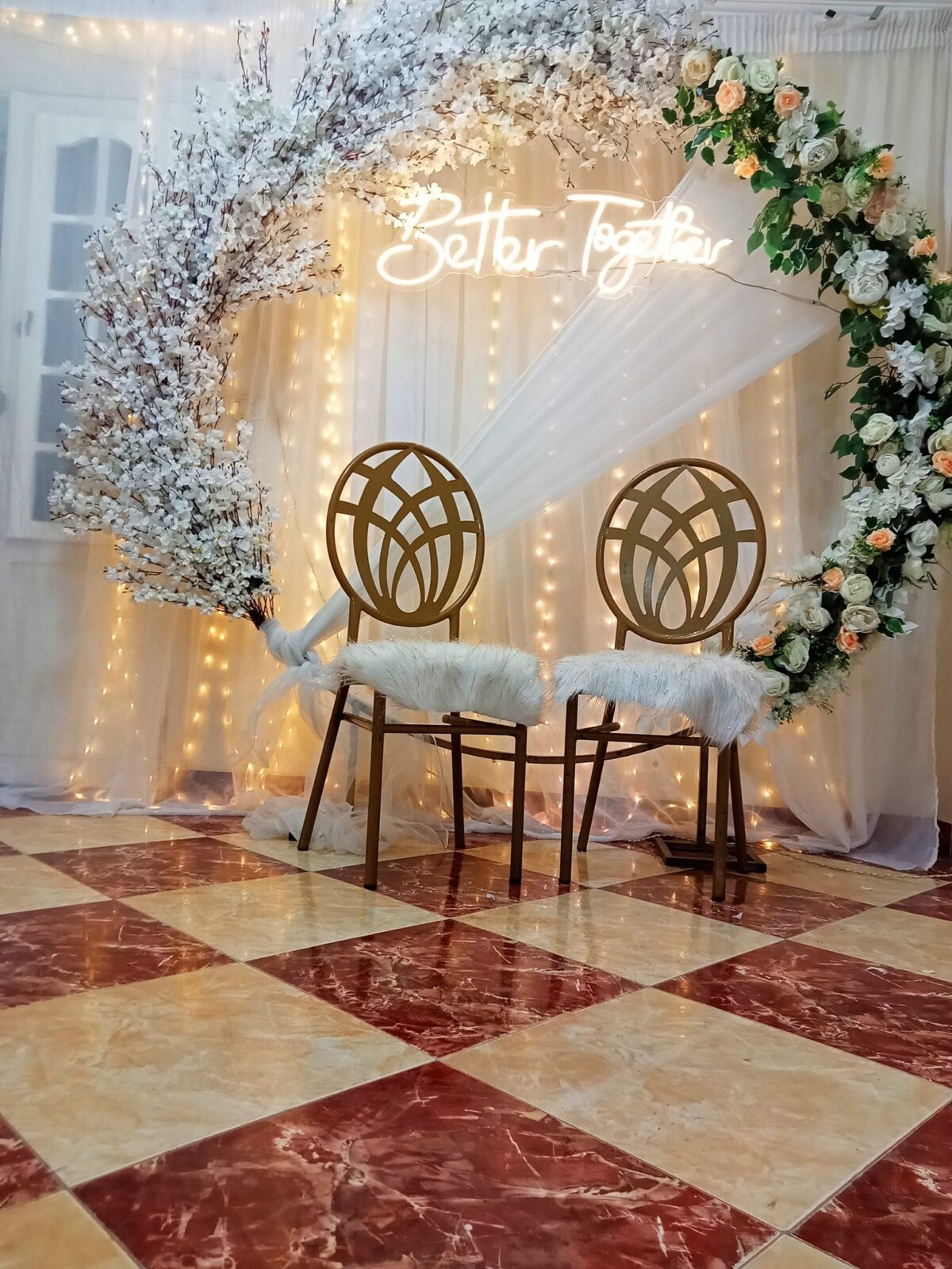 الكوشة دايمًا بتكون متوظفة بذوق، والإضاءة موزونة تدي جو دافي في المكان، والورد بيكون متناسق مع الألوان اللي اختارتها العروسة، وكل عنصر متراجع كذا مرة قبل التنفيذ.