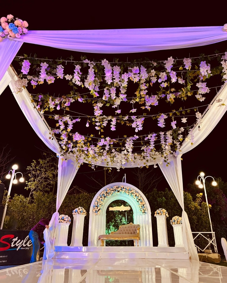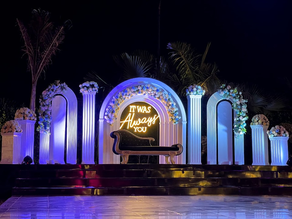 الخلفية الخاصة بالكوشة قابلة للتعديل بسهولة وبتسمح لك تضيف ورود طبيعية أو ستاندات إنارة حسب ثيم المناسبة