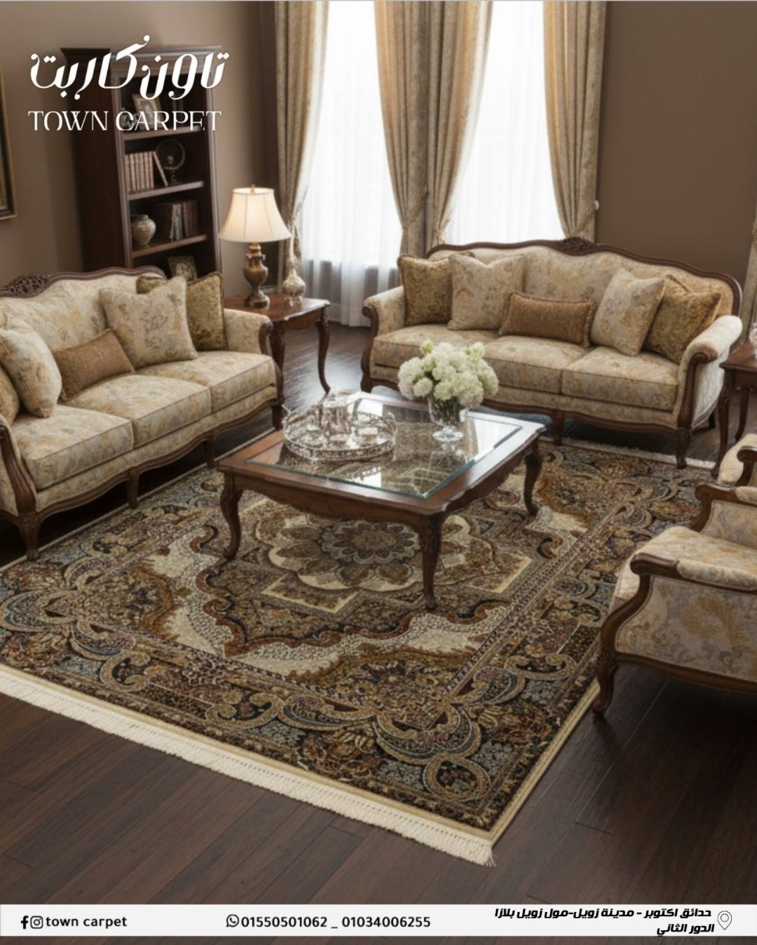 طريقة العرض في تاون كاربت معمولة بشكل يخلي العميل يشوف اللون الحقيقي للقطعة تحت إضاءة مناسبة، لأن فرق الإضاءة ساعات بيغيّر شكل القطعة تمامًا. العرض الواقعي ده بيسهّل على العروسة والعريس يتخيلوا القطعة وسط أثاثهم قبل ما يشتروا، وده يقلل التردد والغلط في الاختيار ويخلي القرار أسرع.