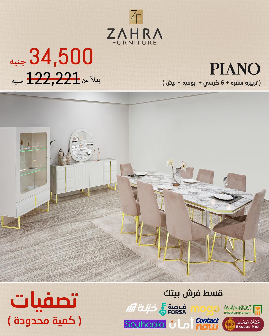 Zahra Furniture بيقدم أسعار مناسبة لمختلف الميزانيات، وكمان بيعمل عروض وتخفيضات بشكل دوري، عشان تقدر تفرش بيتك بأحسن جودة وأفضل سعر.