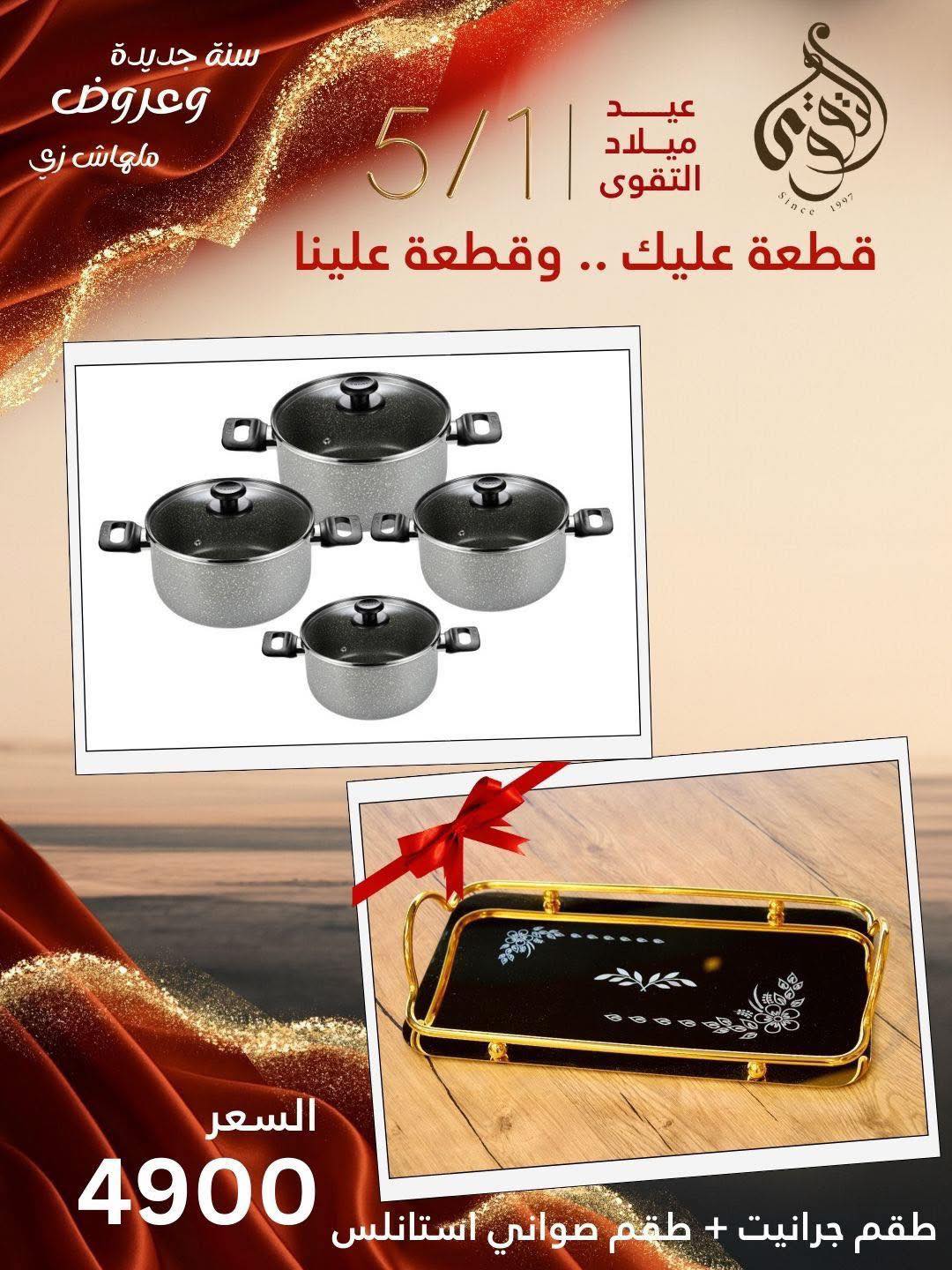 في قسم الطهي، سنتر التقوى بيقدّم قدور ومقالي ستانلس ستيل مقاوم للصدأ بخامات ممتازة وأحجام مختلفة تناسب كل الاستخدامات، وكمان مقالي غير لاصقة بجودة عالية بتوزّع الحرارة كويس وبتخلي الطبخ أسهل. كمان فيه صواني فرن، قوالب سيليكون للحلويات، وأواني زجاج حراري بتصميمات شيك تقدّمي فيها الأكل على السفرة بشكل أنيق وعملي.