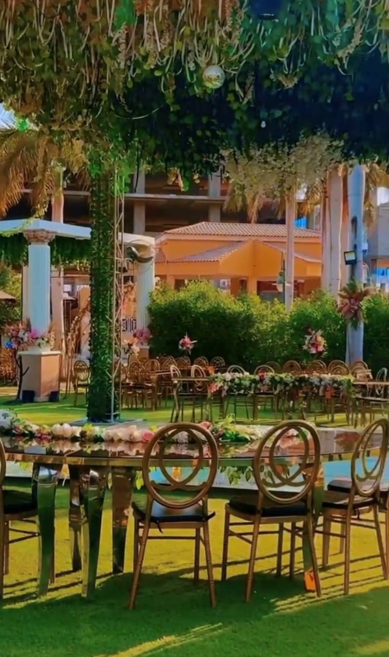المكان فيه توزيع منظم للطاولات والكراسي، وكمان مساحة واضحة للزفة أو فقرة التصوير، وكمان مساحة ممكن تتجهز كمنطقة استقبال أو بوفيه.