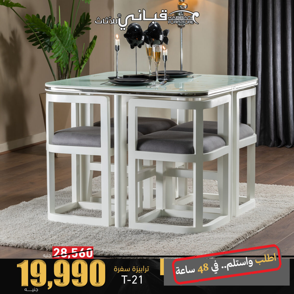 سفرة الأكل عندهم بتتحضر على أعلى مستوى من العملية والأناقة مع بعض. الطاولات مصنوعة من خشب MDF عالي الكثافة مع لمسة خشب طبيعي على الحواف لتجميل التصميم ومحاربة الخدوش اليومية. الكراسي بتكون منجّدة بقماش مريح لدعم الظهر طول الجلسة والجلوس الطويل. في موديلات قابلة للتكديس لو بتحب توفر مساحة بعد الاستخدام، وفي تصاميم كلاسيك بأسطح يدوية التنجيد بتدي شكل ودافئ في الجلسات العائلية.