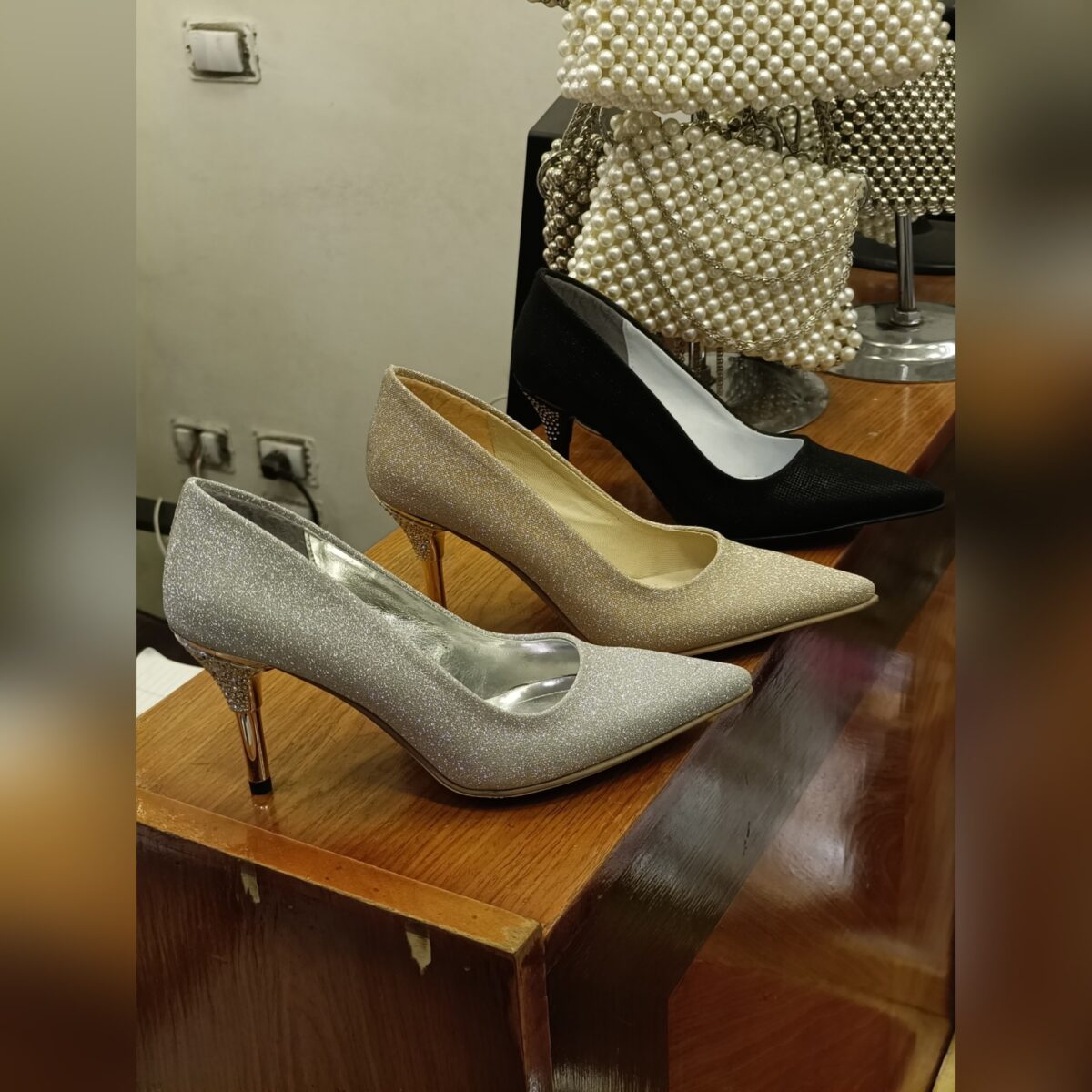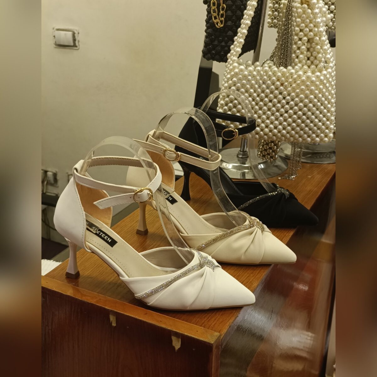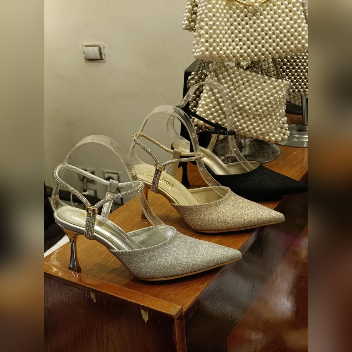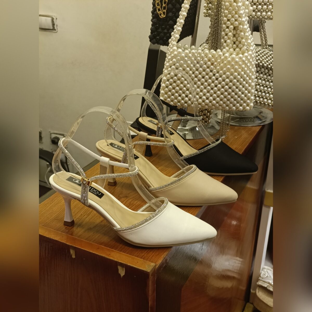 • أحذية كعب عالي مزينة بالكريستالات أو الدانتيل.
