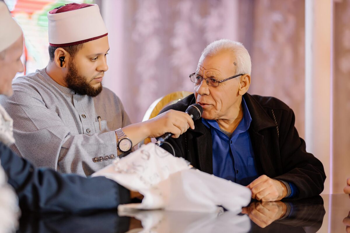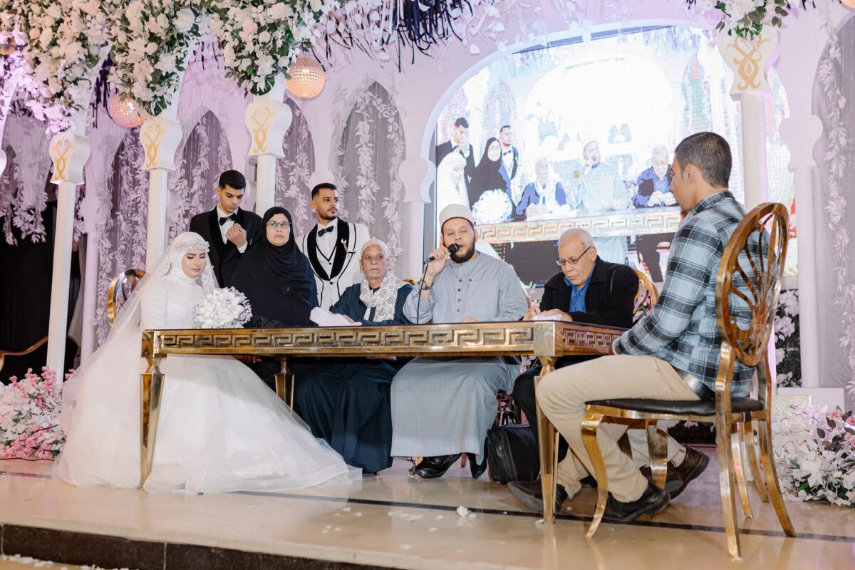 في يوم كتب الكتاب، وجوده بيكون علامة على النظام والدقة. بيحضر في معاده من غير أي تأخير، وبيبدأ الشرح والإجراءات بخطوات بسيطة وواضحة. طريقته في الكلام هادية، بتدي رهبة للموقف وفي نفس الوقت بتخلي العريس والعروسة والأهل فاهمين كل بند بيتقال.