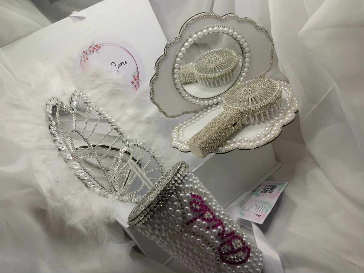 - تيجان خفيفة وشيك مرصعة بالكريستال أو اللؤلؤ.