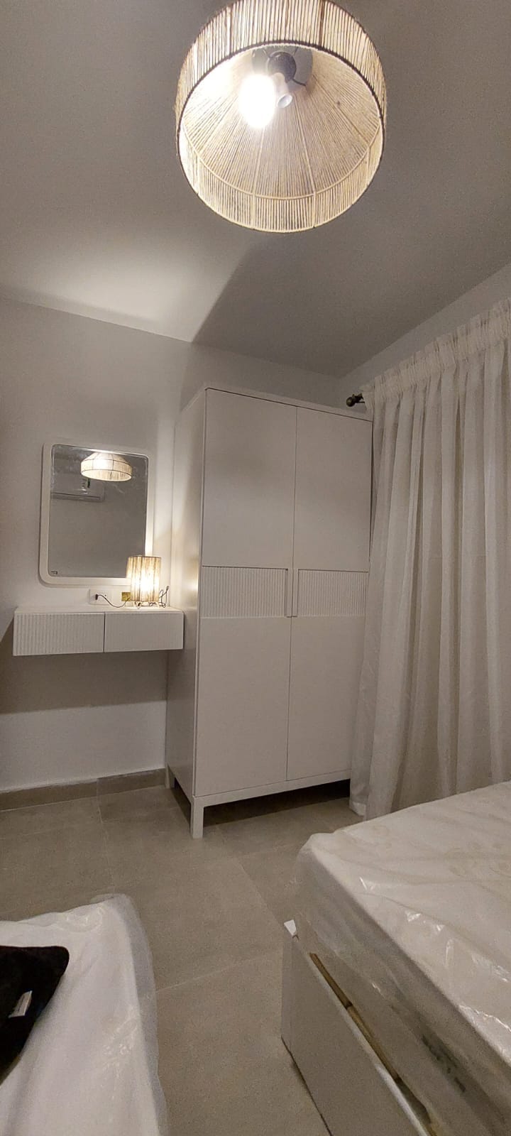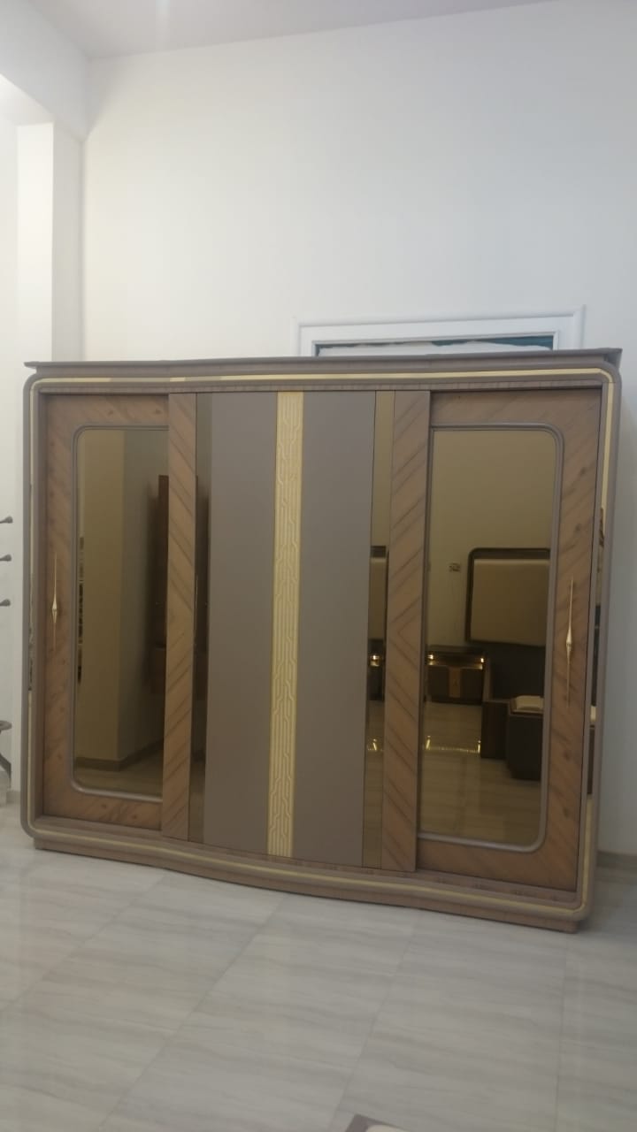 لما تيجي أوض النوم هتلاقي سراير خشب صلب متينة وفيه منها المنجد اللي تحبه، ومعاهم دولاب جرار بمرايات تكبّر المكان بصريًا وتسريحة وكومودينو بإغلاق هادي Soft-Close. الأوضة كلها بتطلع منظمة ومريحة للنوم من أول نظرة.
