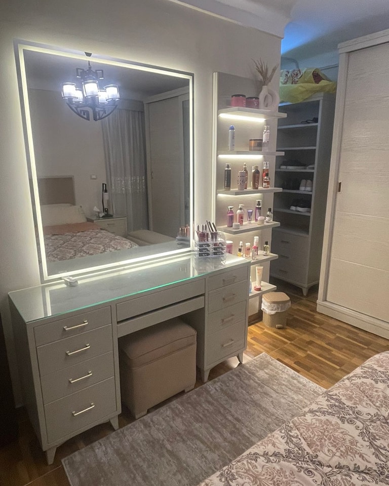 سرير “لو-بروفايل” خشب متين وفيه درج تخزين تحت القاعدة لتوفير مساحات إضافية. الدولاب جرّار مراياه كاملة تساعِد على كبر المكان بصريًا، وتنظيمه الداخلي من رفوف وأدراج بيخليك ترتّب كل حاجة في مكانها. التسريحة والكومودينو بيشتغلوا بنظام Soft-Close، وإغلاقهم هادي من غير “دوشة”.