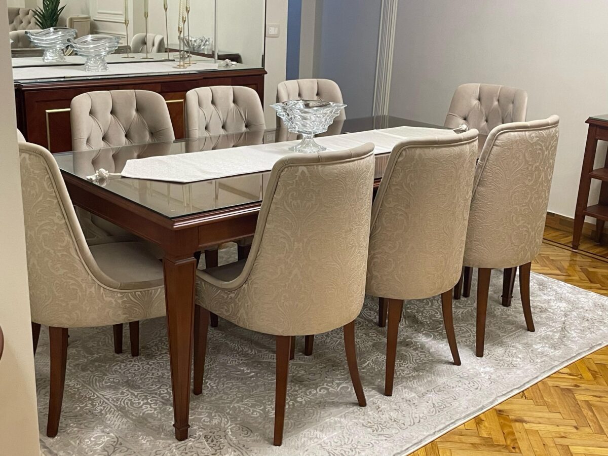 تشكيلة السفرة عند عزّت للأثاث فيها طاولات قابلة للتمديد من 4 لـ8 كراسي بسهولة، بأسطح رخام صناعي أو خشب معالج ضد الخدش. الكراسي تنجيدها مبطّن ومريح للظهر، والألوان متوازنة ما بين البيج والترابي والرمادي. لو عايز بوفيه أو نيش، هتلاقي عندهم قطع متناسقة تكمل ستايل السفرة.