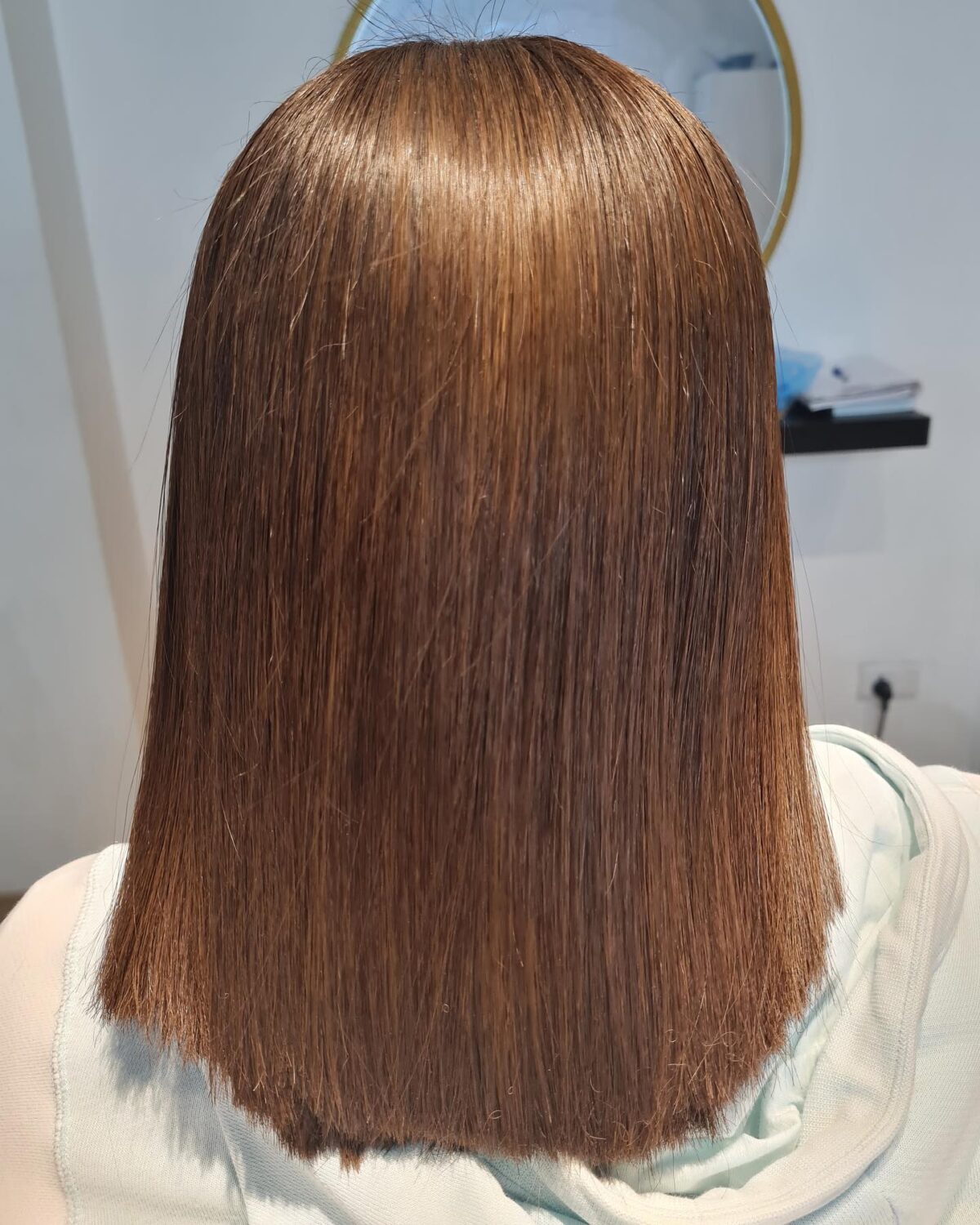 اللون بيتظبط حسب لون شعرك وبشرتك، علشان يبان طبيعي جدًا بعد ما يهدى. مفيش استخدام لألوان جاهزة بشكل مباشر، لكن بيتم خلط درجات توصل لشكل ناعم ومتناسق مع ملامحك.
