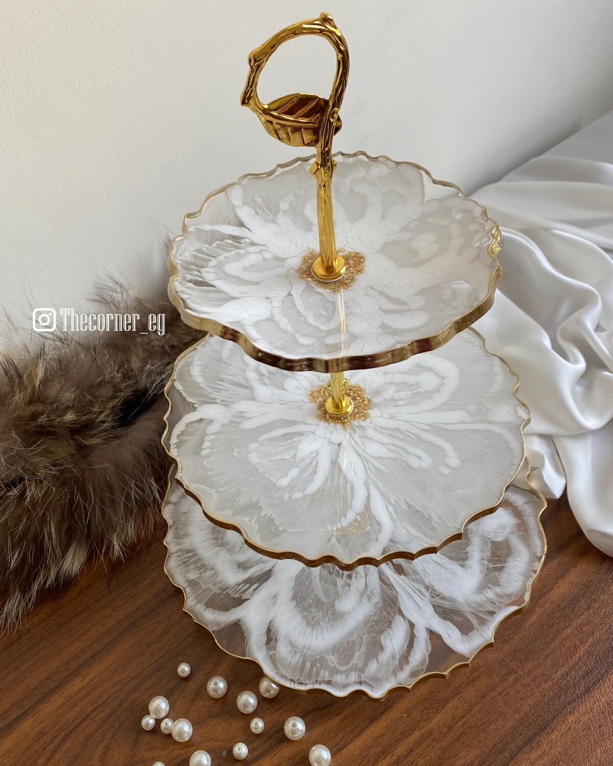 • صواني تقديم هاند ميد فيها طبقات من الريزن الشفاف مع إضافات زي ورد مجفف أو جليتر أو لمسات معدنية لامعة.