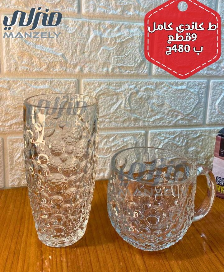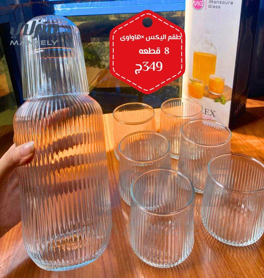أما قسم السفرة والتقديم، فمتنوع جدًا. أطقم أطباق بورسلين وزجاج بتصميمات مودرن وألوان هادية تناسب كل الأذواق، ومعاها كاسات عصير وفناجين قهوة وشاي. كمان فيه صواني تقديم وأباريق عملية وشيك تضيف لمسة مرتبة للسفرة وتسهّل الضيافة سواء في المناسبات أو في الاستخدام اليومي.