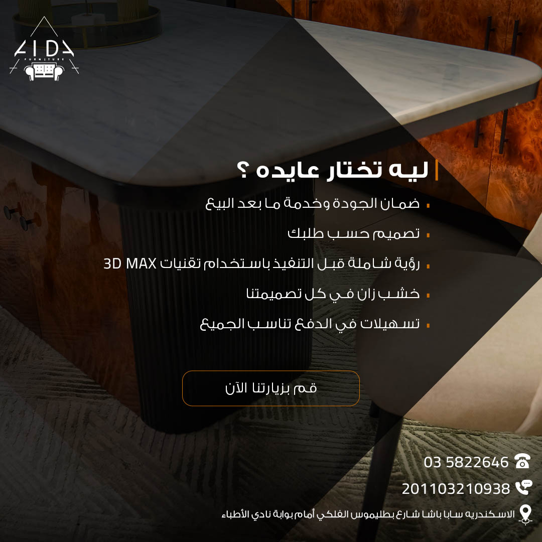 في النهاية، لو نفسك تفرّش بيتك بذوق فني وبتفاصيل تبان إنها غالية ومنتقاة، يبقى Aida Furniture اختيار مميز هيخليك تحس إن بيتك ليه شخصية خاصة وشكل مختلف.