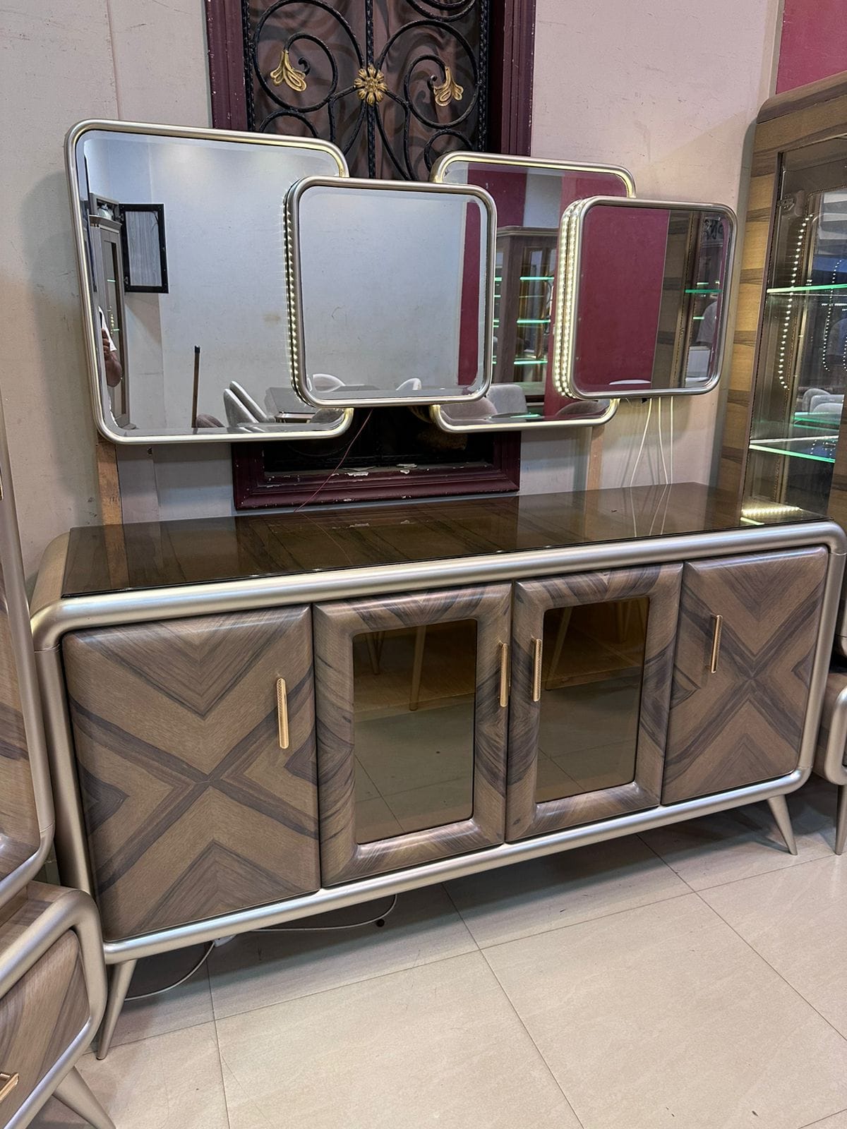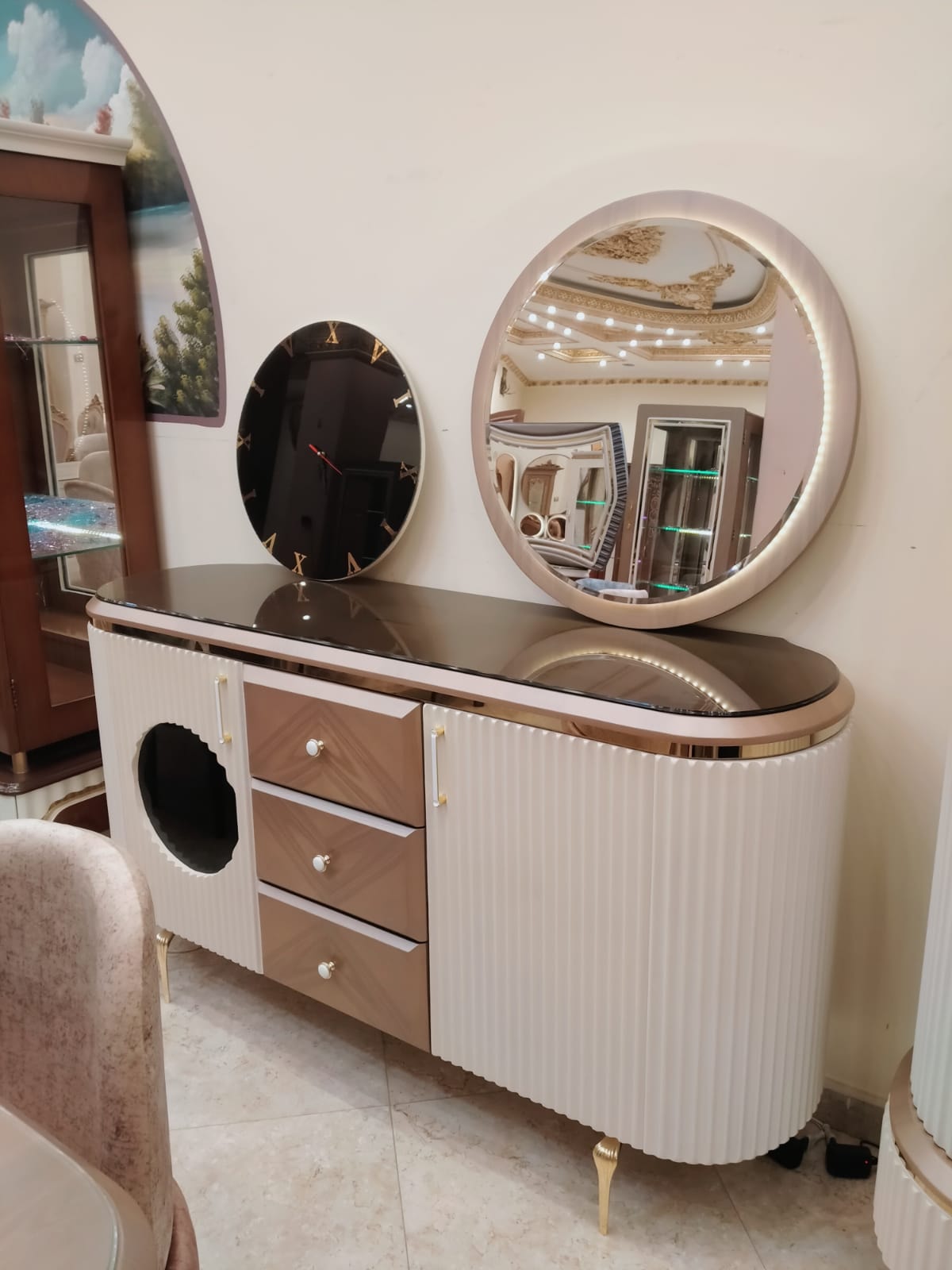 السفرة في موبليات قصر الملكة ليها طابع ملكي بسيط: طاولات extensible من ٤ لـ٨ كراسي بآلية pull-out سلسة، السطح رخام صناعي مقاوم للبقع أو خشب natural veneer مع طبقة حماية ضد الخدش. الكراسي بتصميم ergonomic، مسند ظهر منحني خفيف يدعم العمود الفقري في جلسات العيلة الطويلة. لو بتحب دقة التنظيم، فيه بوفيه ونيش بواجهات push-to-open وأرفف زجاجية مدعمة بإضاءة LED داخلية لعرض أطقم السفرة والديكور كأنك في متحف صغير.