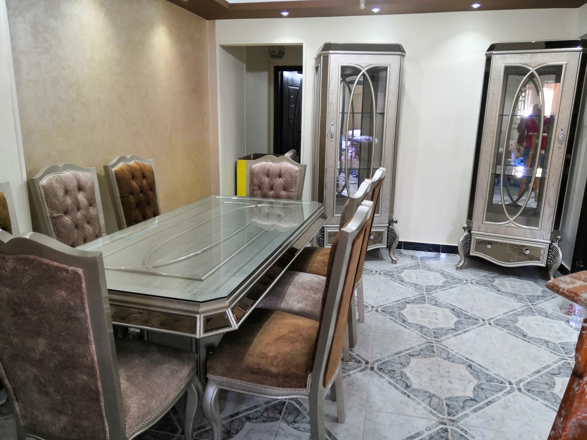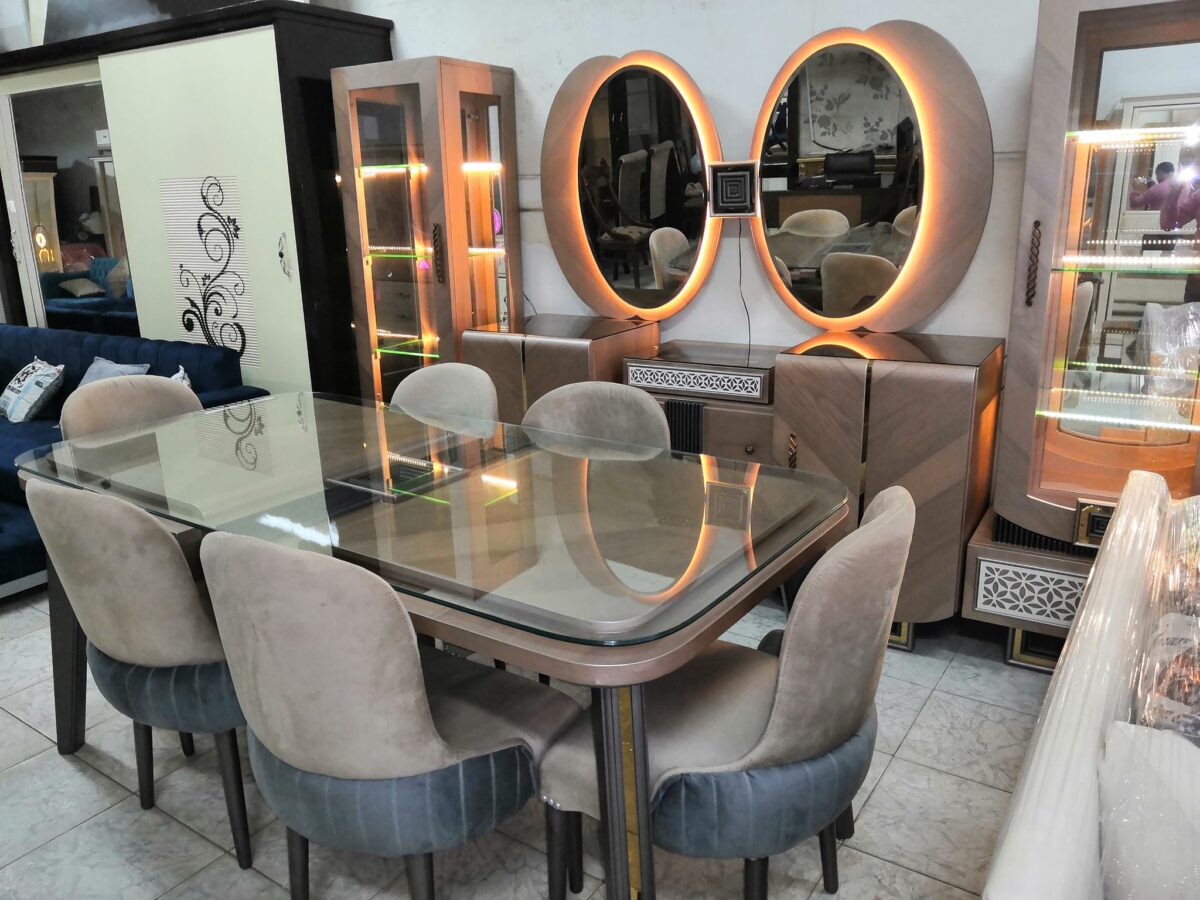 – الكراسي مدعمة ظهرها عشان الراحة في عزومات العيلة الطويلة، ومنجّدة بقماش عملي أو مخملي حسب ستايل بيتك.