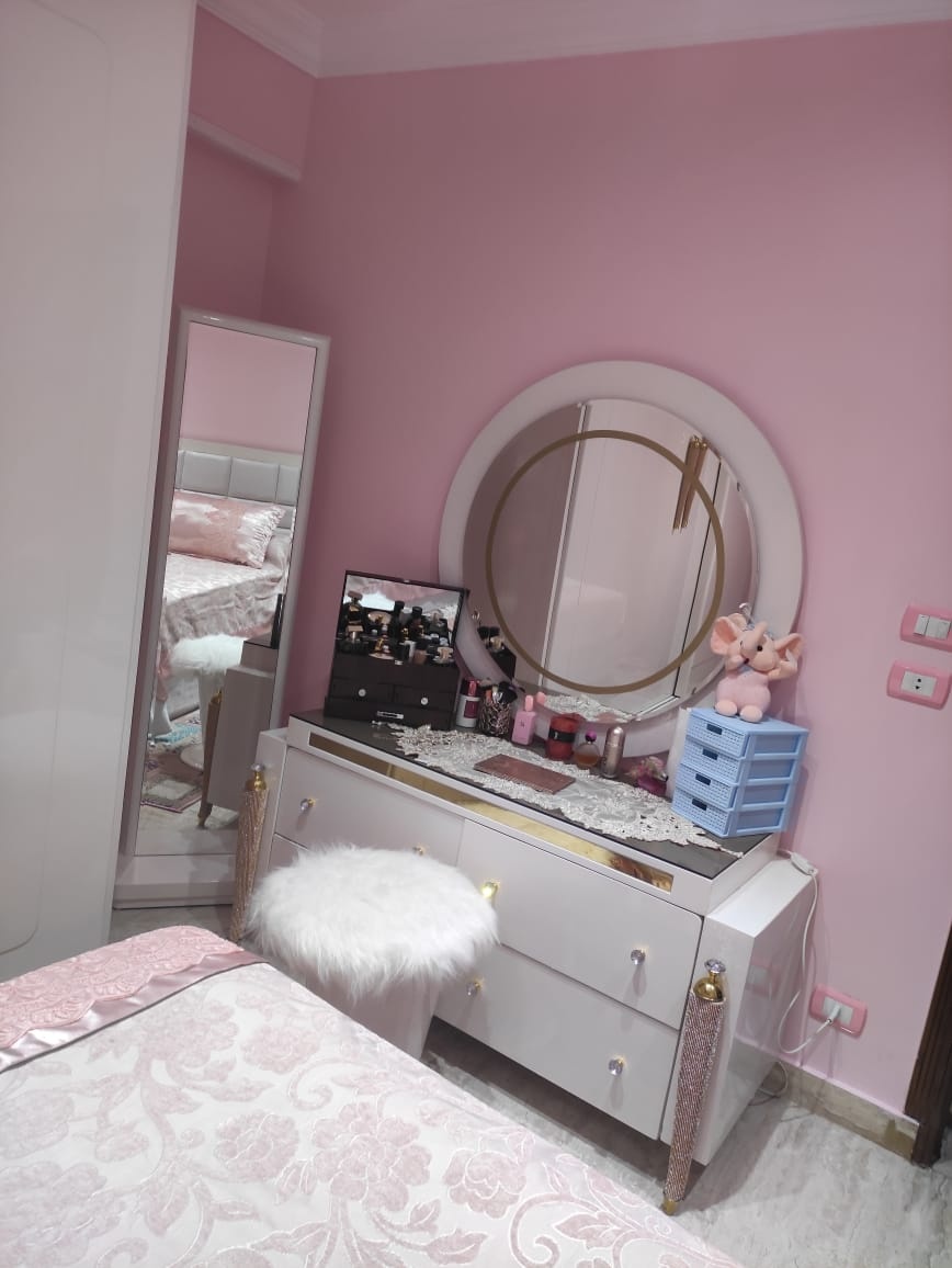 – دولاب Sliding Doors بواجهات مرايا كاملة تكبّر المكان بصريًا وتنظّم اللبس في رفوف وأدراج وحِمالات.