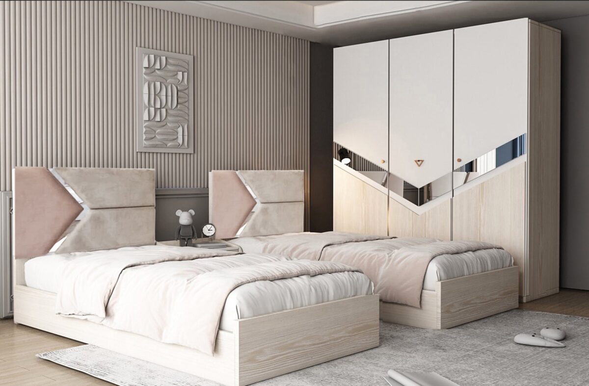 اللي يميّز غرف النوم عندهم إن تصميمها مريح للعين، سواء في السراير المنجّدة أو الخشب اللي بيجمع بين القوة والشكل الأنيق. فيه سراير بتكون بظهر عريض أو بتفاصيل تنجيد ناعمة، والدولايب هناك متقسمة بذكاء، سواء كانت جرار أو مفصّلة، وبتوفرلك مساحات تخزين عملية. تسريحات الغرف وكوموديناتها كمان معمولين بنفس روح التصميم علشان تحافظ على تناسق الشكل.