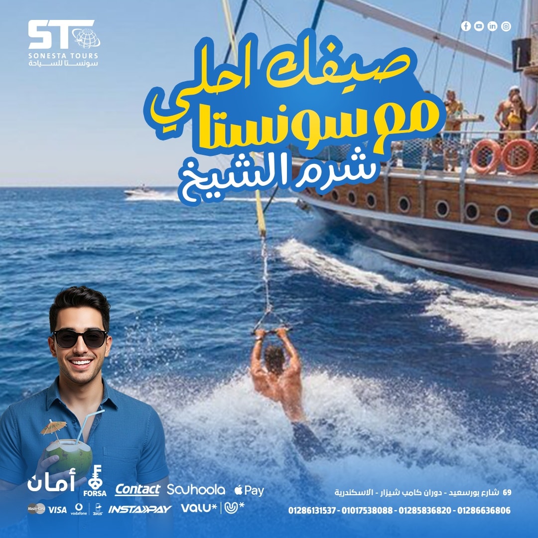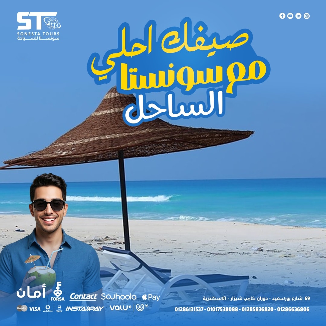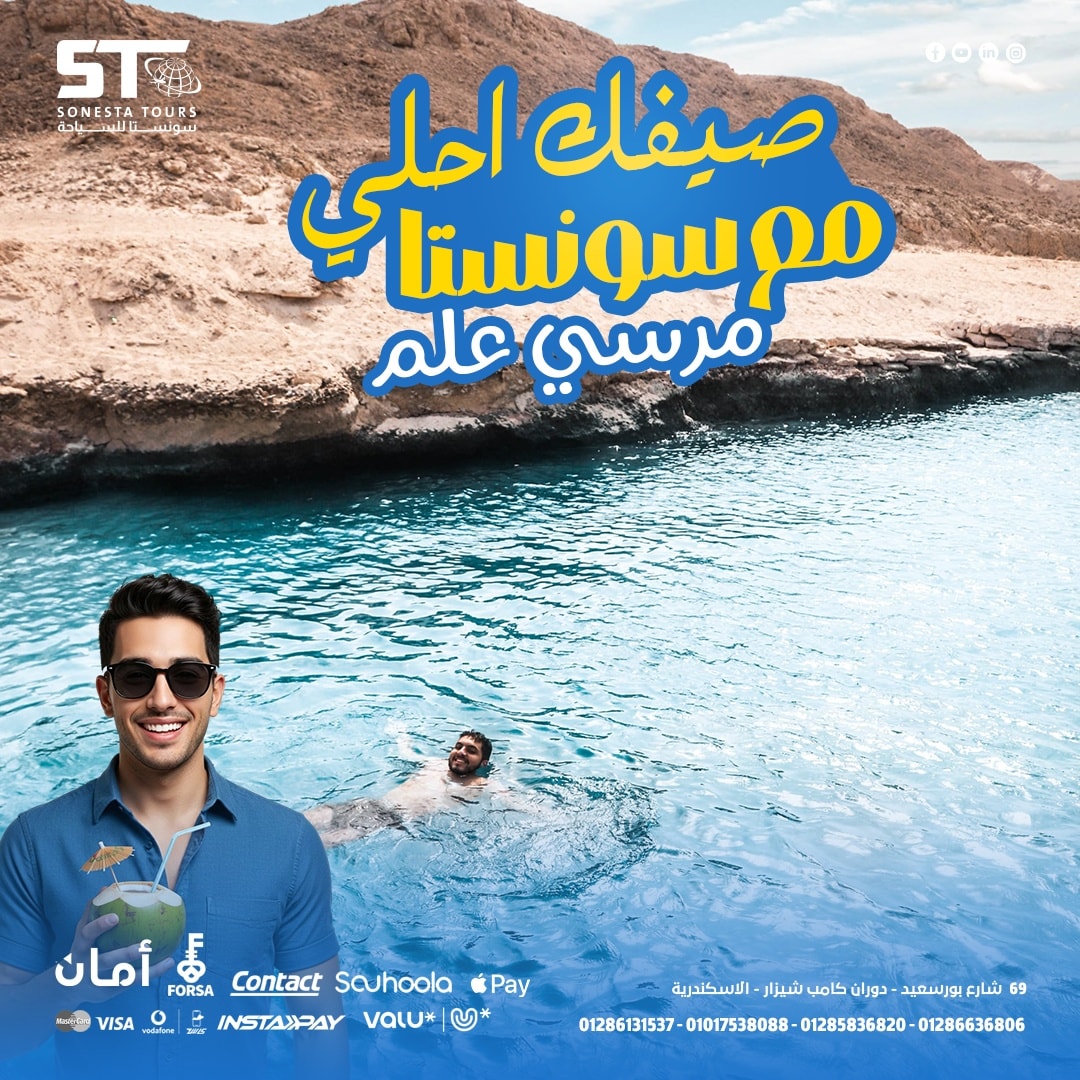 شركة سونستا للسياحة معروفة بتنظيمها المحترف وباقات السفر اللي بتريح بالك وتوفر فلوسك في نفس الوقت. من رحلات داخل القاهرة للأهرامات والأقصر وأسوان، لفسحات شاطئية في البحر الأحمر أو حتى جولات صحراوية، سونستا هتكون شريكك الأمثل تبدأ معاك الحلم وتوصّله لمرحلة التنفيذ بكل سلاسة.