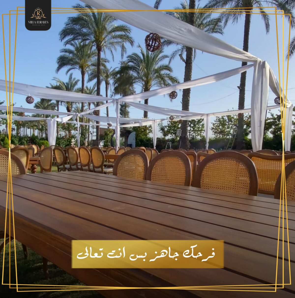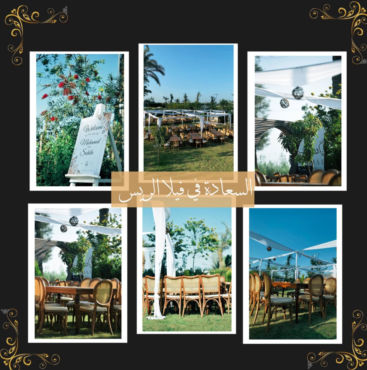 الفيلا فيها أماكن مفتوحة وجلسات داخلية بتسمح بتنظيم الفرح أو الخطوبة أو كتب الكتاب بشكل مريح، مع توزيع للطاولات يناسب عدد الضيوف.