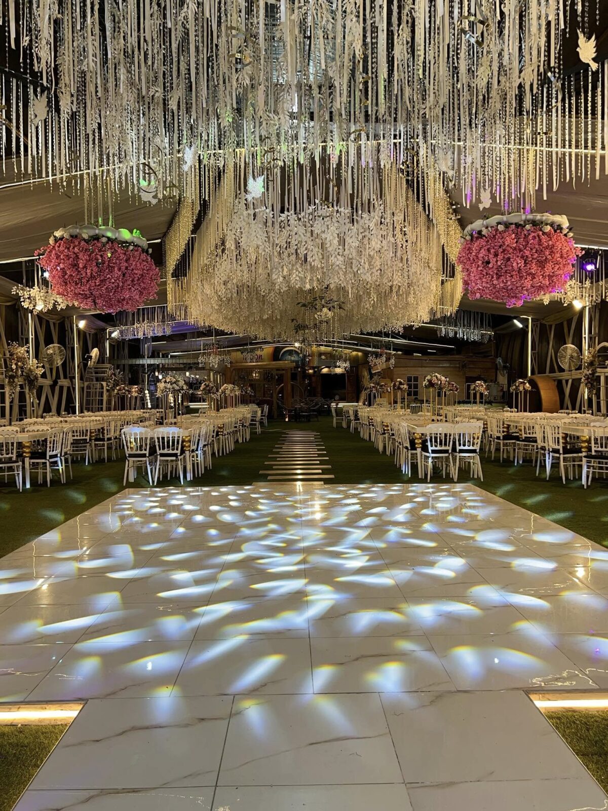 أما بالنسبة للزفة ومساحة الرقص، المكان متجهز بشكل يسمح بتنفيذ أي فكرة يحبها العروسان. مساحة واسعة تمشي عليها الدخلة براحتك من غير زحمة، وتحت الإضاءة المناسبة اللحظة تبقى أقوى وأوضح. الضيوف يقدروا يشوفوا كل الفقرات بسهولة لأن المكان مفتوح ومتنظم، وده يخلي الجو العام كله مريح ومبهج.