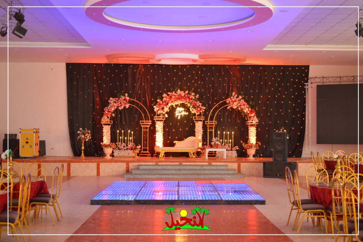 مساحة الرقص والزفة في قريه النخيل واسعة ومناسبة لأي فكرة يحب العرسان ينفذوها. سواء دخلة بمؤثرات خفيفة، أو ممر ورد، أو دخلة بسيطة على المزيكا، كل حاجة بتبان بشكل هادي ومبهج. الضيوف كمان بيقدروا يشوفوا كل حاجة من غير زحمة لأن المكان مفتوح وواسع، وده بيخلي الجو العام للفرح مريح جدًا.