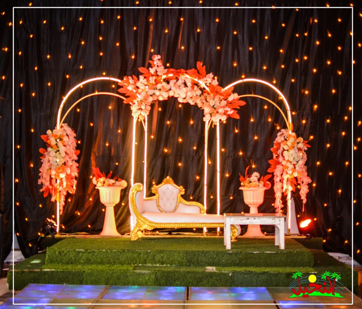 الكوشة في قريه النخيل ليها شكل مميز لأنها بتتعمل غالبًا على خلفية طبيعية، وده بيخلي شكلها في الصور مختلف عن أي قاعة عادية. الإضاءة الهادية حوالين المكان بتكبر تأثير اللحظة، خصوصًا وقت دخلة العريس والعروسة. المصورين بيحبوا المكان لأنه يديهم فرص لقطات كثيرة من زوايا مختلفة، سواء على الخضرة، في المدخل، أو في المساحات الواسعة اللي حوالين القاعة.