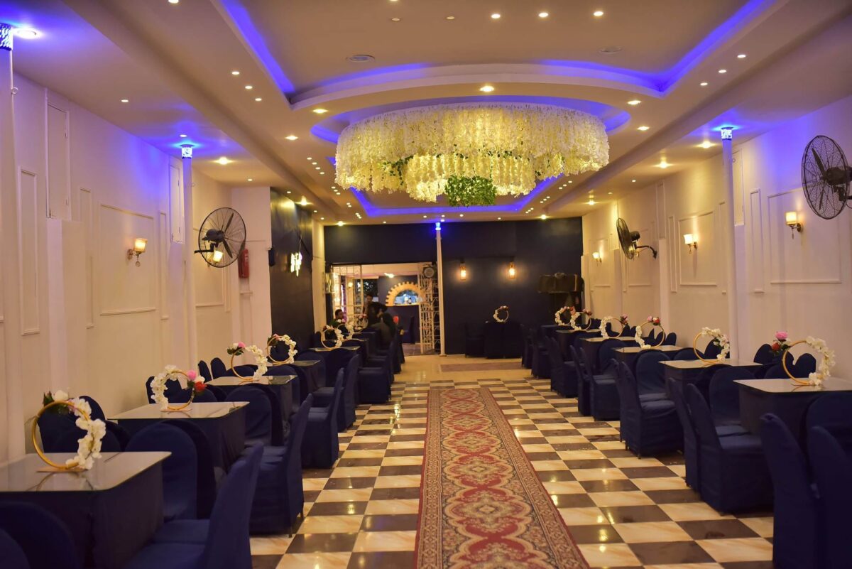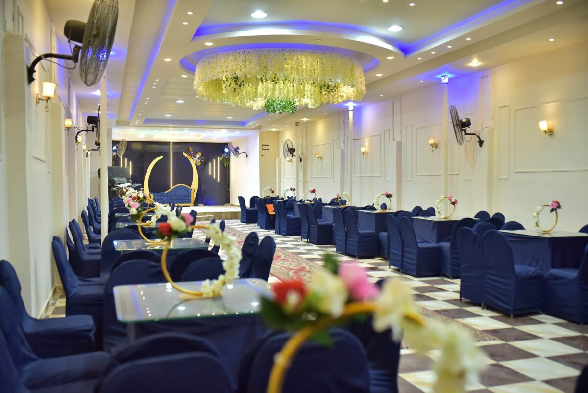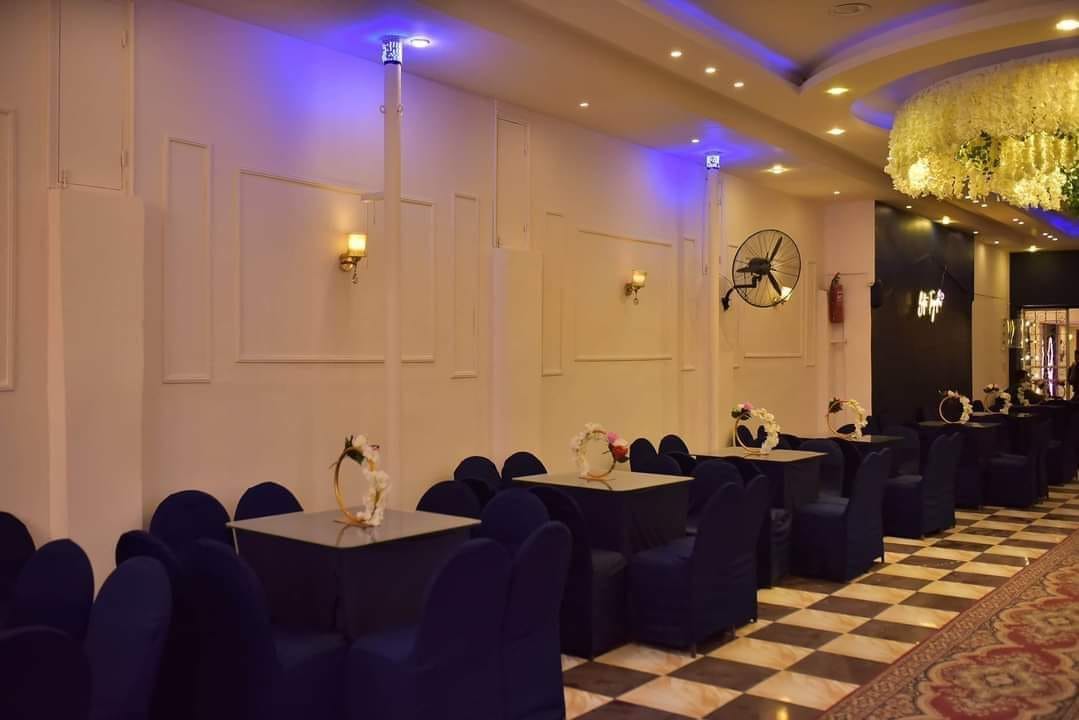القاعة بتستوعب عدد متوسط من الضيوف، ومع كده كل حاجة فيها مترتبة صح من توزيع الطاولات لحد مكان الكوشة.