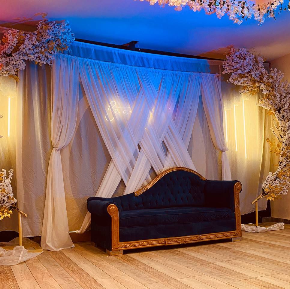 القاعة ديكورها عصري وراقي، بألوان هادية وإضاءة بتدي جو مريح ومناسب لأي نوع من المناسبات سواء فرح، خطوبة أو كتب كتاب.