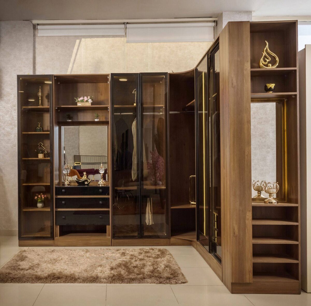في غرف النوم، هتلاقي السراير بتصميم فخم، سواء مودرن أو نيوكلاسيك، والظهر منجّد بأقمشة فخمة زي القطيفة أو الجلد الصناعي، والدولايب كبيرة ومتقسمة بذكاء، بعضها أبواب جرار وفيه كمان مرايات بتدي إحساس بالوسع. تسريحة الغرفة والكومودينات معمولين بشكل يكمّل الفخامة دي.