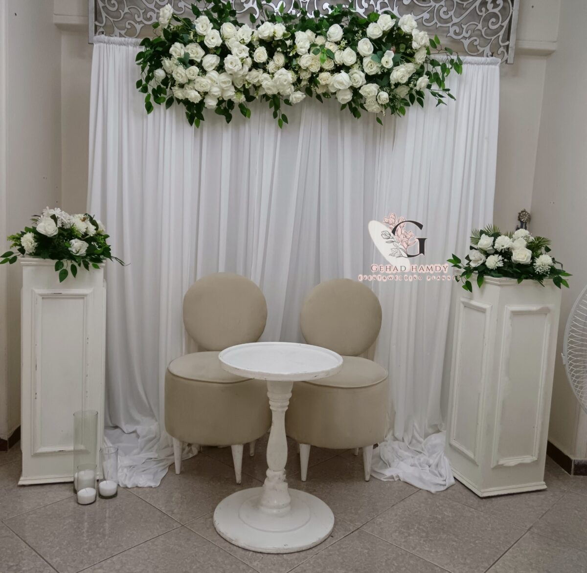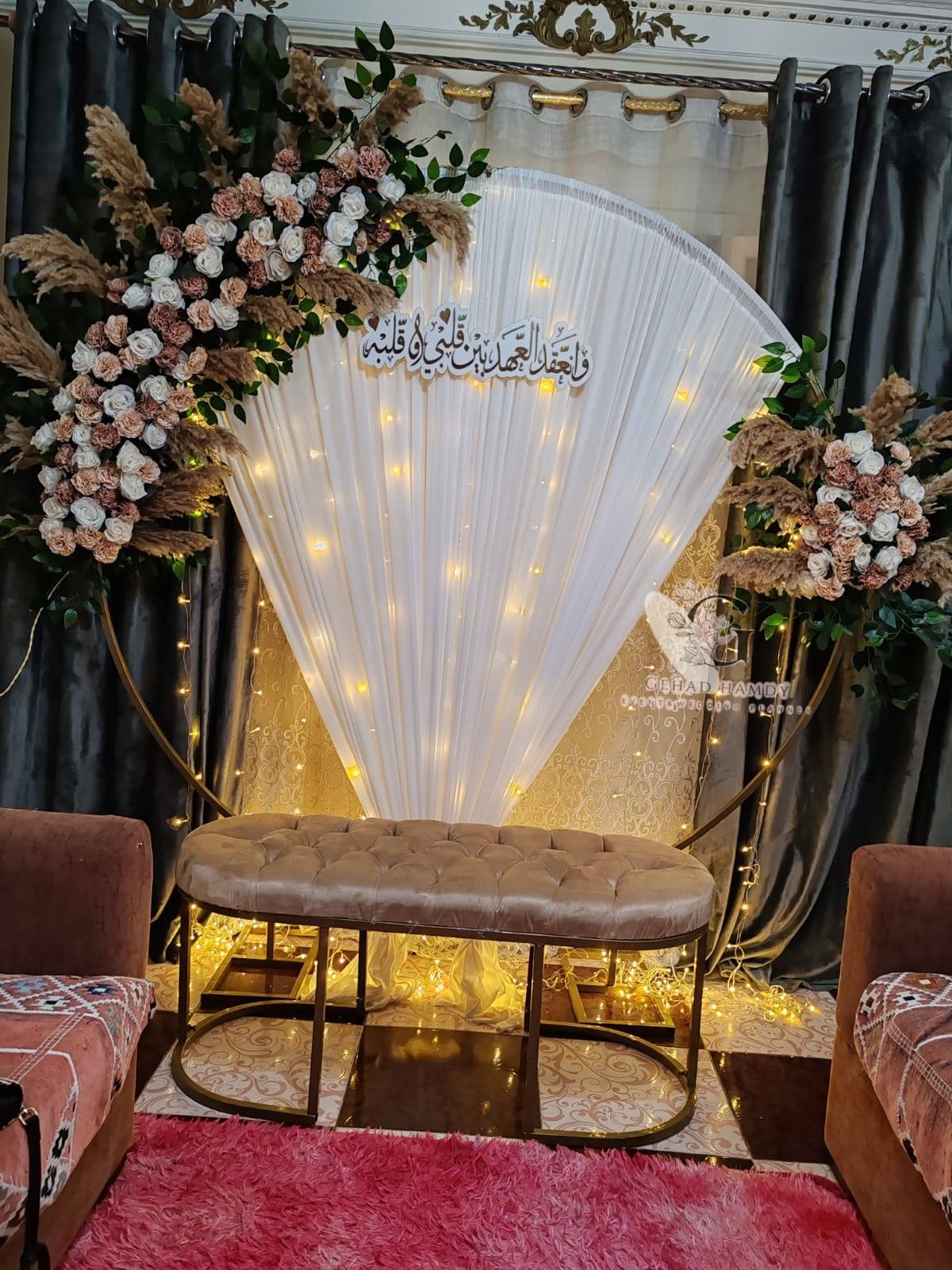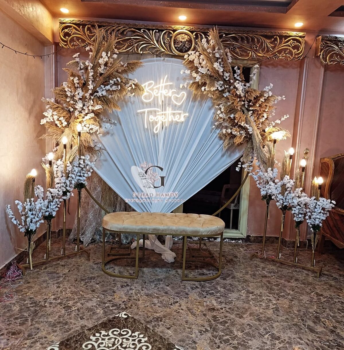 من ناحية الميزانية، Gehad Hamdy عندها مرونة وبتعرف تقدم بدائل عملية تناسب إمكانيات العروسين. ممكن تقترح ورود موسمية بدل الأنواع الغالية، أو تعتمد على توزيع إضاءة يغني عن ديكورات مكلفة. الهدف عندها إن الشكل النهائي يبان شيك وأنيق وفي نفس الوقت يكون في حدود الميزانية.