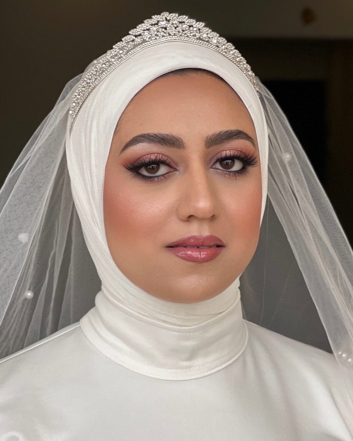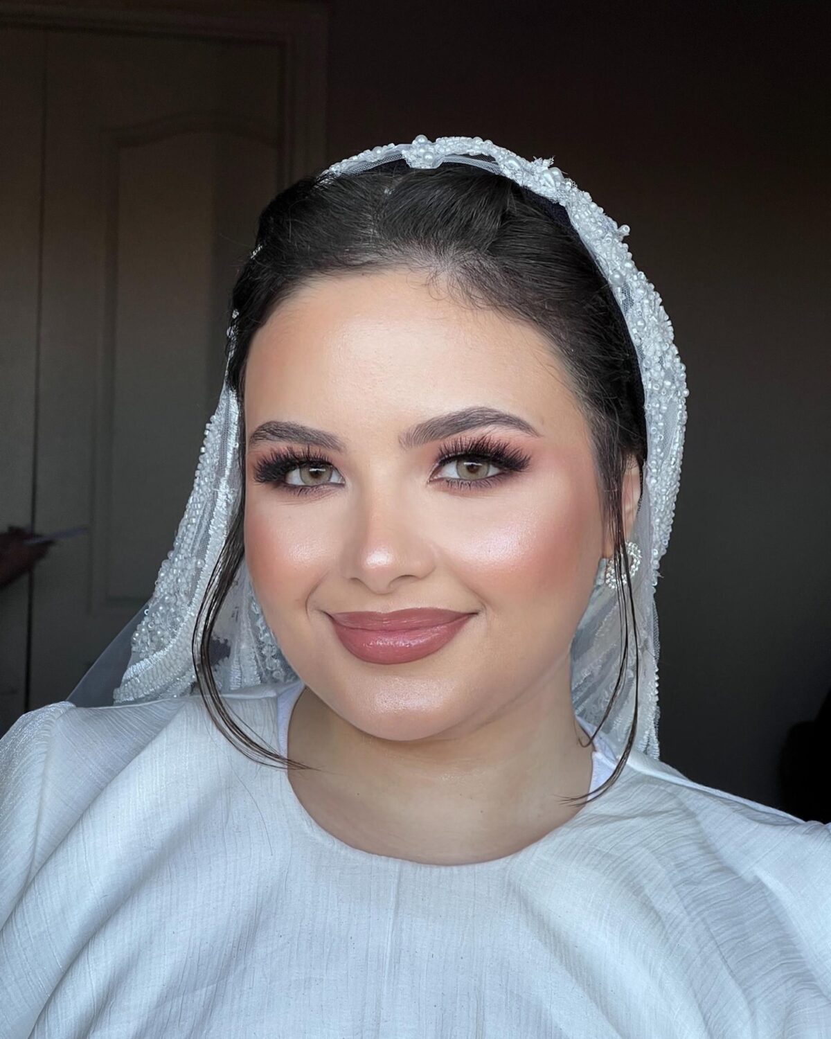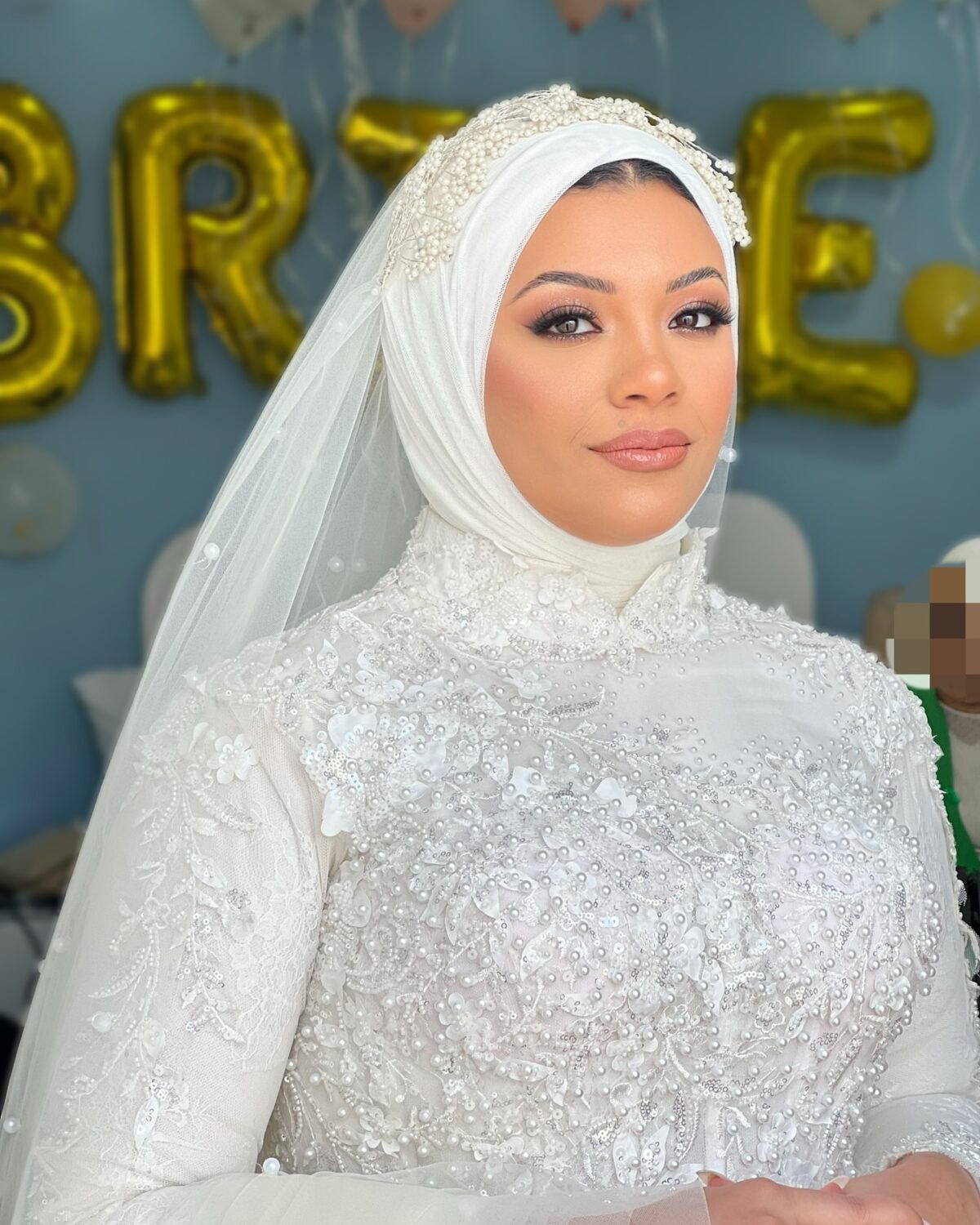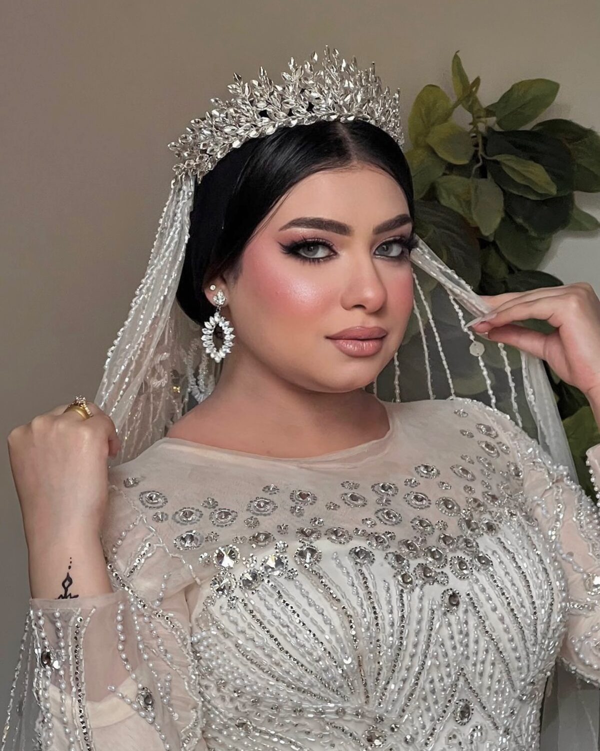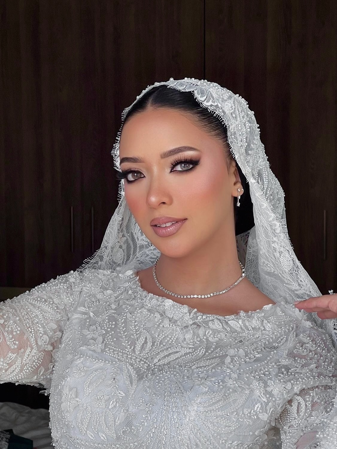 هويدا بدوي بتحب الستايل الكلاسيكي اللي بيعتمد على الخامة أكتر من الزخرفة. الطرح دي بتكون بخامات زي التول الخفيف أو الشيفون الناعم، بتدي إحساس بالرقي وتناسب الفساتين اللي فيها شغل كتير.
