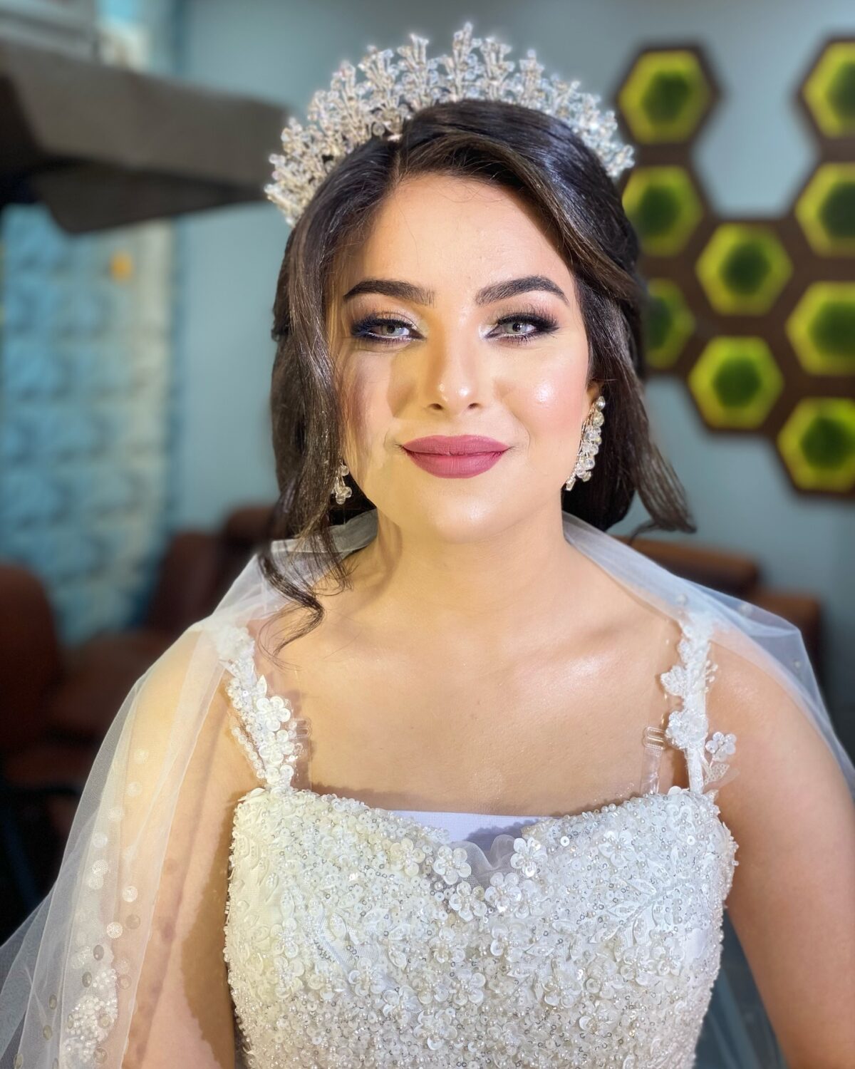 الألوان اللي بيختارها دايمًا متناسقة ومريحة للعين. التركيز بيكون على إظهار ملامح العروسة من غير ما يخلي شكلها متغير. الميكب هناك مش استعراض، لكنه شغل دقيق بيعتمد على فهم الشكل والطبيعة.