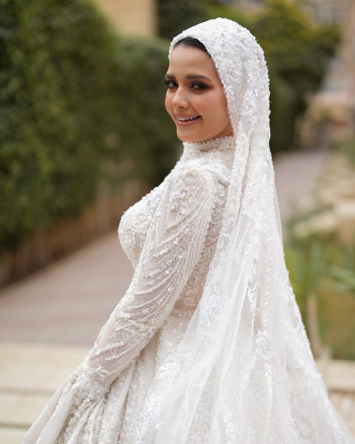 أميرة يحيى كمان بتحب التجديد، وده باين في بعض التصميمات اللي فيها دمج بين أكتر من خامة، زي الطرحة اللي فيها دانتيل خفيف أو لمعة بسيطة. التصميمات دي بتناسب البنات اللي بتحب الشكل العصري لكن من غير مبالغة.