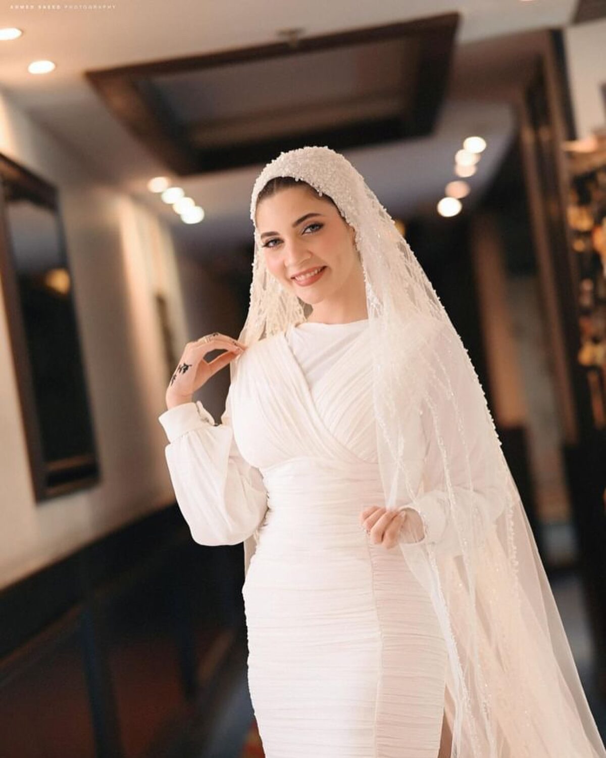 أميرة يحيى بتحب تعتمد على البساطة في التصميم، فهتلاقي عندها طرح بخامات خفيفة زي التول والشيفون، من غير شغل كتير. النوع ده من الطرح بيدي شكل أنثوي وراقي، وبيليق على الفساتين اللي فيها تفاصيل أو تطريز.