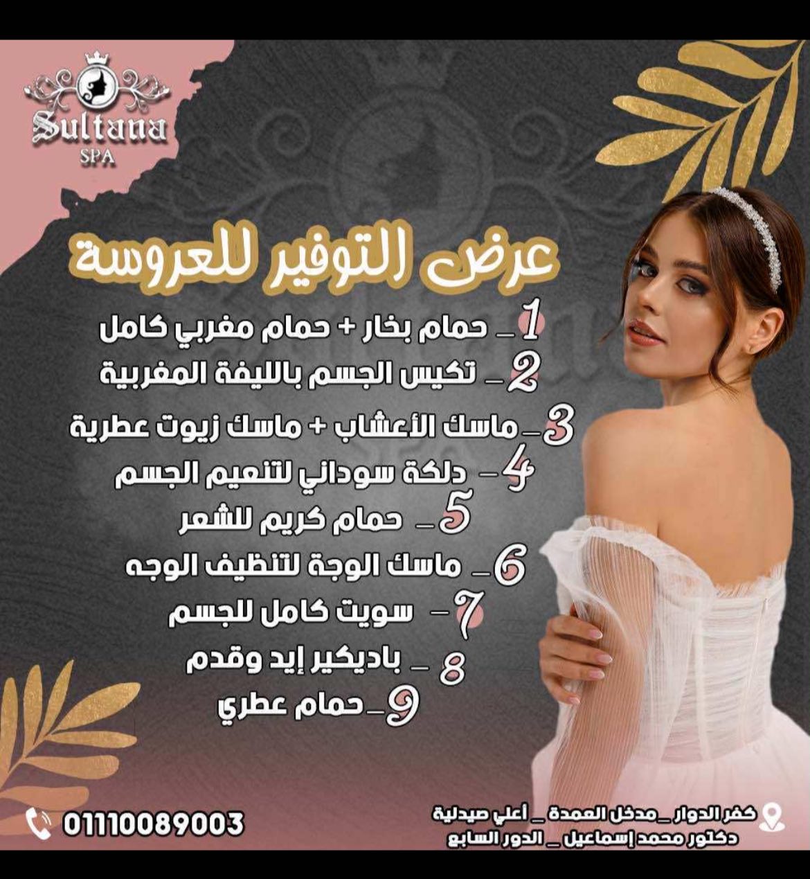 سلطانة سبا من الأماكن اللي فعلاً بتعيش فيها تجربة فخمة ومريحة في نفس الوقت، الاسم لوحده بيحكي عن الأجواء هناك، لأن كل حاجة معمولة بروح ملكية كأنك سلطانة حقيقية. من أول ما تدخلي المكان بتحسي بالهدوء والرقي، والإضاءة والموسيقى الهادية بيخلوكي تنسي أي توتر أو تعب. المكان معمول مخصوص لكل البنات والعرايس اللي عايزين يجهزوا نفسهم قبل الفرح ويهتموا بجمالهم براحة ورفاهية.