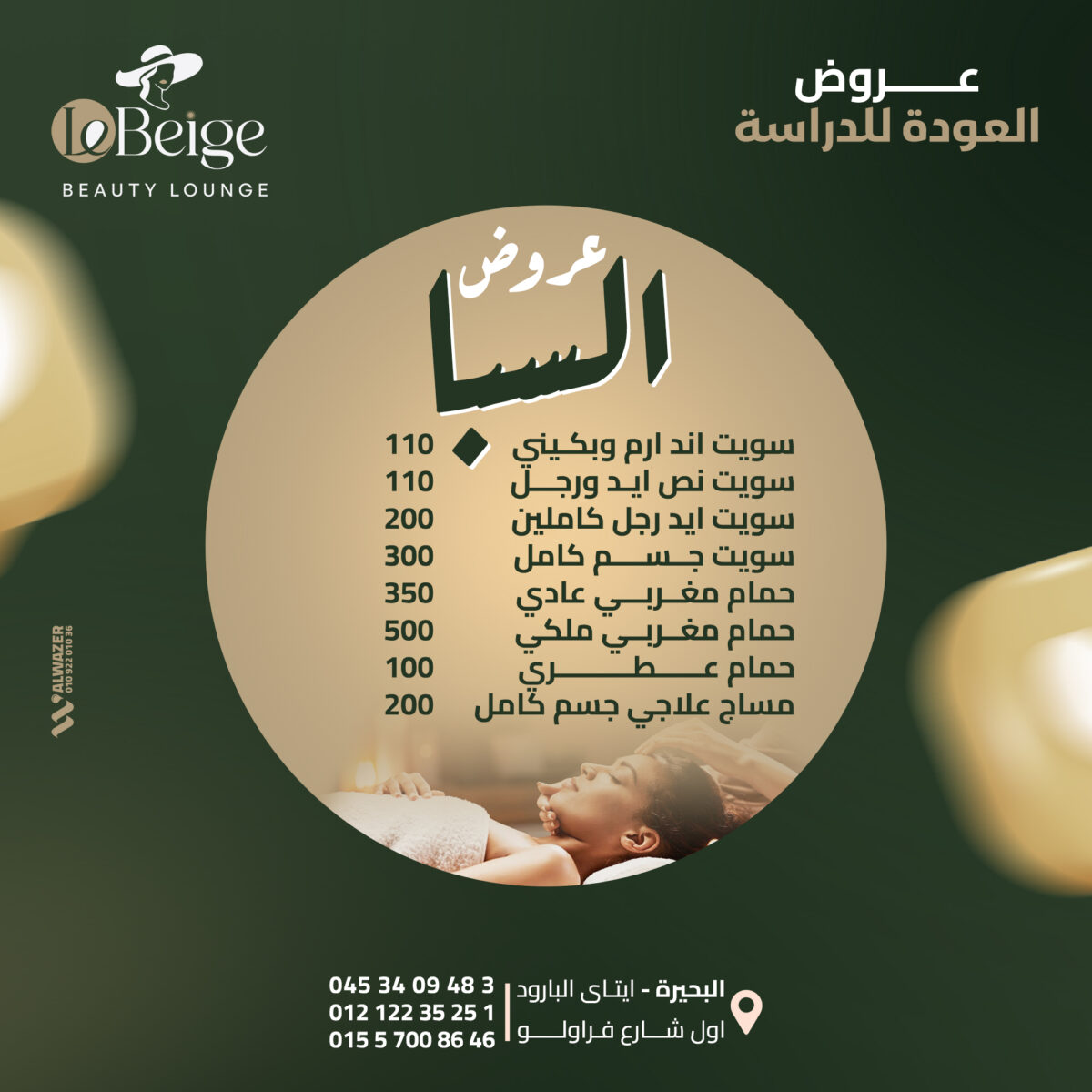 Le Baige Beauty Lounge من الأماكن اللي ليها طابع راقي جدًا وبتقدم تجربة مختلفة في عالم الجمال والعناية. من أول لحظة بتدخلي المكان بتحسي إنك في جو شيك ومريح في نفس الوقت، كل حاجة فيه معمولة بذوق عالي من ديكور وإضاءة وموسيقى هادية، وده بيخليكي تفصلي عن أي توتر وتستمتعي بلحظة العناية بنفسك.