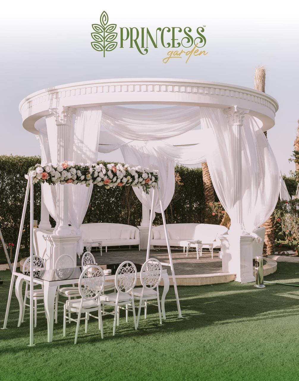 الديكور في برنسس جاردن بسيط وبيستعمل ألوان حيادية زي البيج والأوف وايت مع لمسات أخضر طبيعي للنباتات. الأعمدة مزخرفة بنقوش بسيطة وعليها أضواء خفيفة تعكس جمال الجاردن بالليل. الخلفية الخاصة بالكوشة قابلة للتغيير بسهولة، وتقدر تضيف ورود طبيعية أو ستاندات إنارة صغيرة أو ثيمات معلقة.