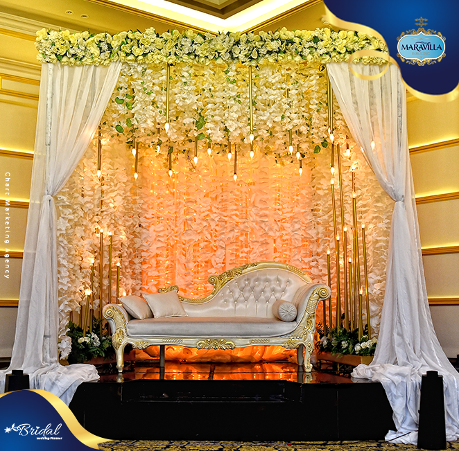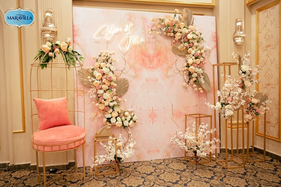 الديكور فى مارفيلا بسيط بألوان حيادية بين البيج والأوف وايت مع لمسات خشبية خفيفة على الأعمدة أو على إطار الكوشة الخلفية الخاصة بالكوشة قابلة للتعديل بسهولة تقدر تضيف ورود طبيعية أو ستاندات إنارة أو فوانيس حسب ثيم الحفل ده بيساعدك تضيف لمستك الخاصة من غير مجهود كبير