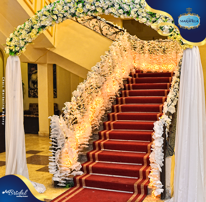 قاعة مارفيلا مساحة متوسطة تستوعب من 100 لحد 250 ضيف حسب توزيع الترابيزات والكراسي الممر الرئيسي واضح وواسع لدخول العرسان أو لضيوف الشرف والكوشة موجودة فى مقدمة القاعة بحيث كل الحضور يقدر يشوف الحدث بوضوح الجلسات موزعة بشكل عملى بيسمح بحرية الحركة من غير تكدس
