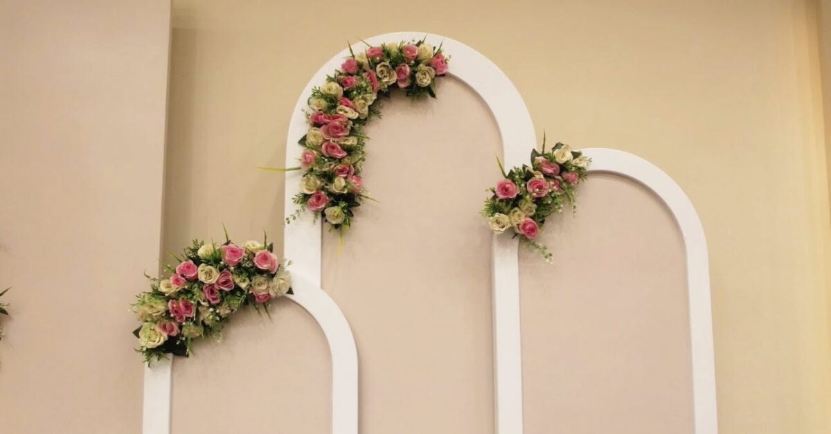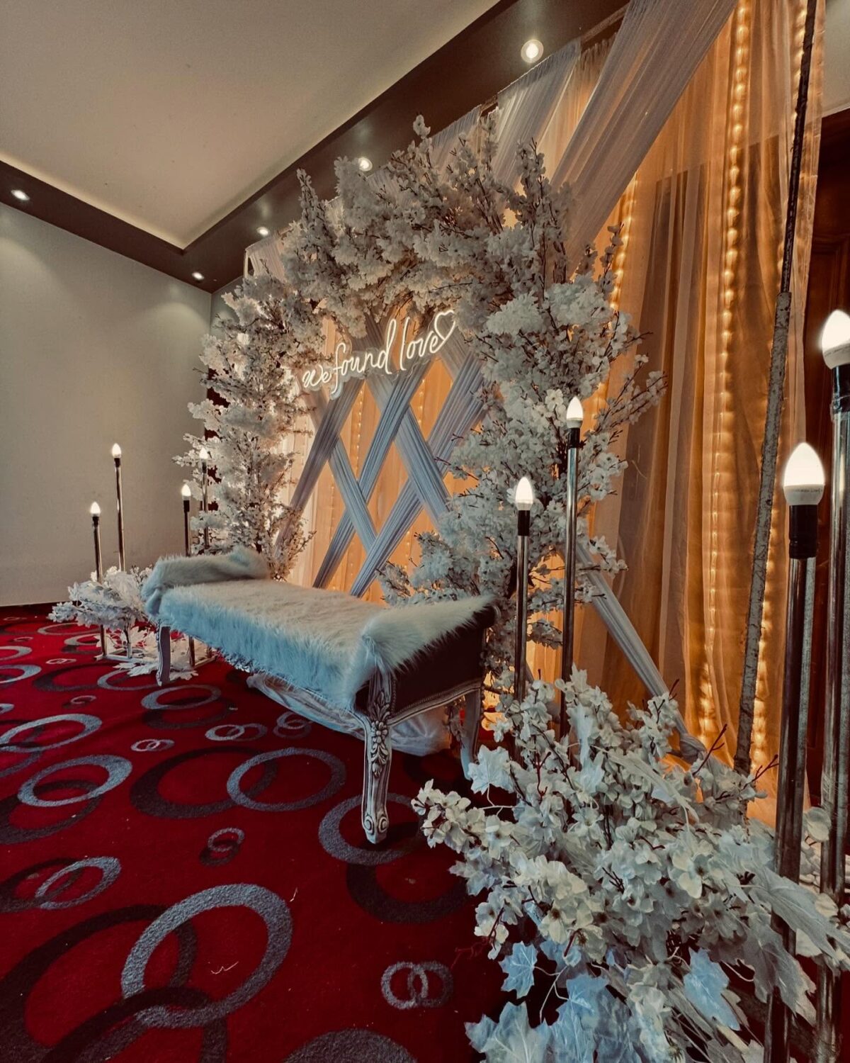 الديكور في فور سيزون بسيط وألوان الجدران محايدة مما يسهل إضافة لمستك الخاصة سواء ورود طبيعية أو إضاءات خفيفة أو ثيم معين ديكور الكوشة تقدر تختاره وتضيف له خلفية تناسب ثيم الحفل