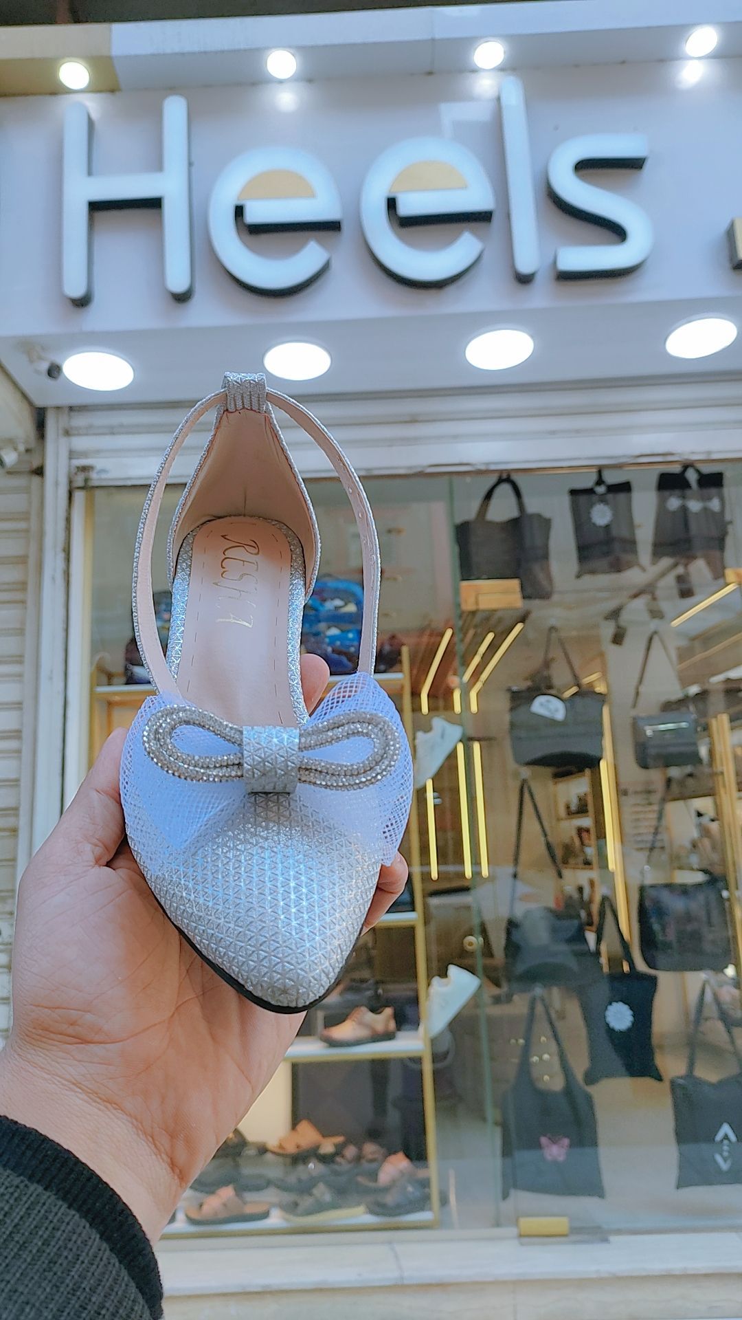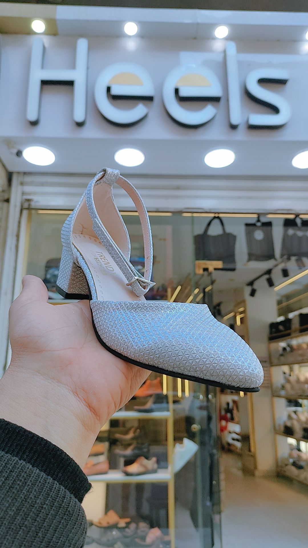 • كعب عالي بفصوص لامعة أو تطريز بسيط.