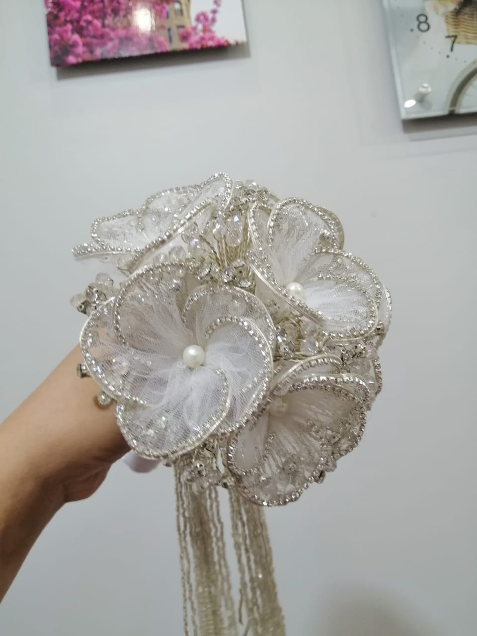 - شريطة ساتان راقية حواليه أو لمسات من اللؤلؤ.