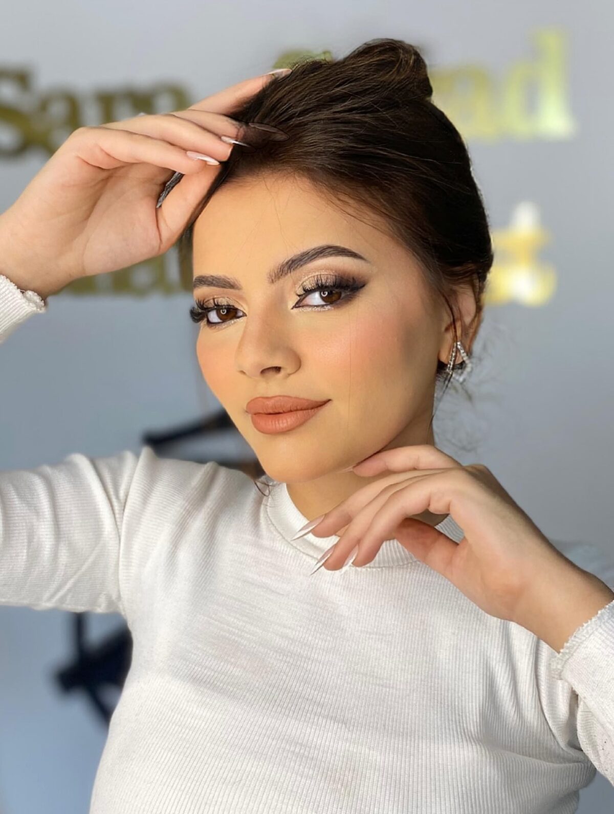 أما في المناسبات زي الخطوبة أو السهرات، فـ سارة بتعرف تزود شوية لمسات تناسب طبيعة اليوم، سواء في العين أو الشفايف. رسمة العين عندها بتعتمد على شكل عينك، وبتستخدم الألوان بشكل يفتحها ويظهرها من غير ما تكون صاخبة أو مبالغ فيها. الروج بتختاره بدقة، وكل تفصيلة في المكياج بتراعي فيها تناسق اللون مع لبسك وذوقك.