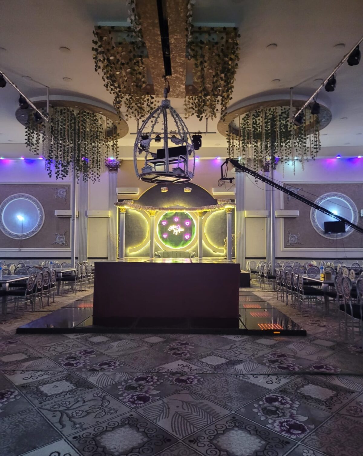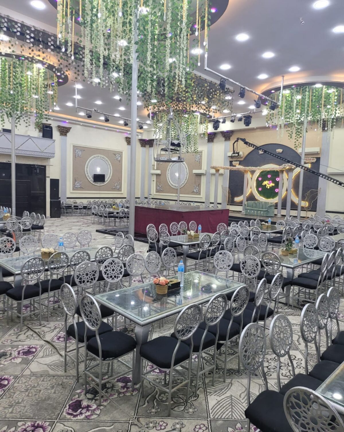 قاعة ليلة العمر متقسمة بشكل مريح، المساحة بتسمح باستقبال عدد متوسط من الضيوف، مع توزيع منظم للطاولات والكراسي. الكوشة موجودة في مكان واضح، والإضاءة موزعة بشكل يساعد في إبراز تفاصيل القاعة، سواء حفلتك بالنهار أو في المساء.
