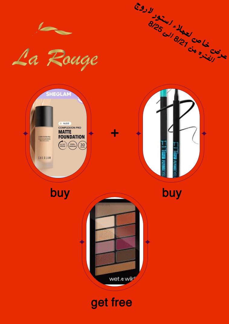 La Rouge مش مجرد محل ميكب، لكنه تجربة كاملة بتجمعلك كل اللي محتاجاه في مكان واحد. من الأساسيات زي الفاونديشن والكونسيلر لحد اللمسات الأخيرة زي الهايلايتر والروج، كله متوفر بجودة وأسعار مناسبة.
