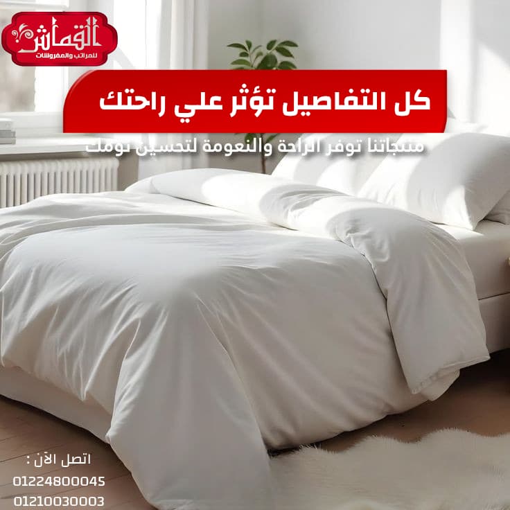 القماش للمفروشات والمراتب بيهتم بكل تفاصيل الراحة، علشان كده بيوفّر واقيات مراتب مقاومة للمياه بتسمح بالتهوية وتحافظ على المرتبة جديدة أطول فترة ممكنة. كمان فيه مخدات فايبر وميموري فوم بتدي دعم مثالي للرأس والرقبة.