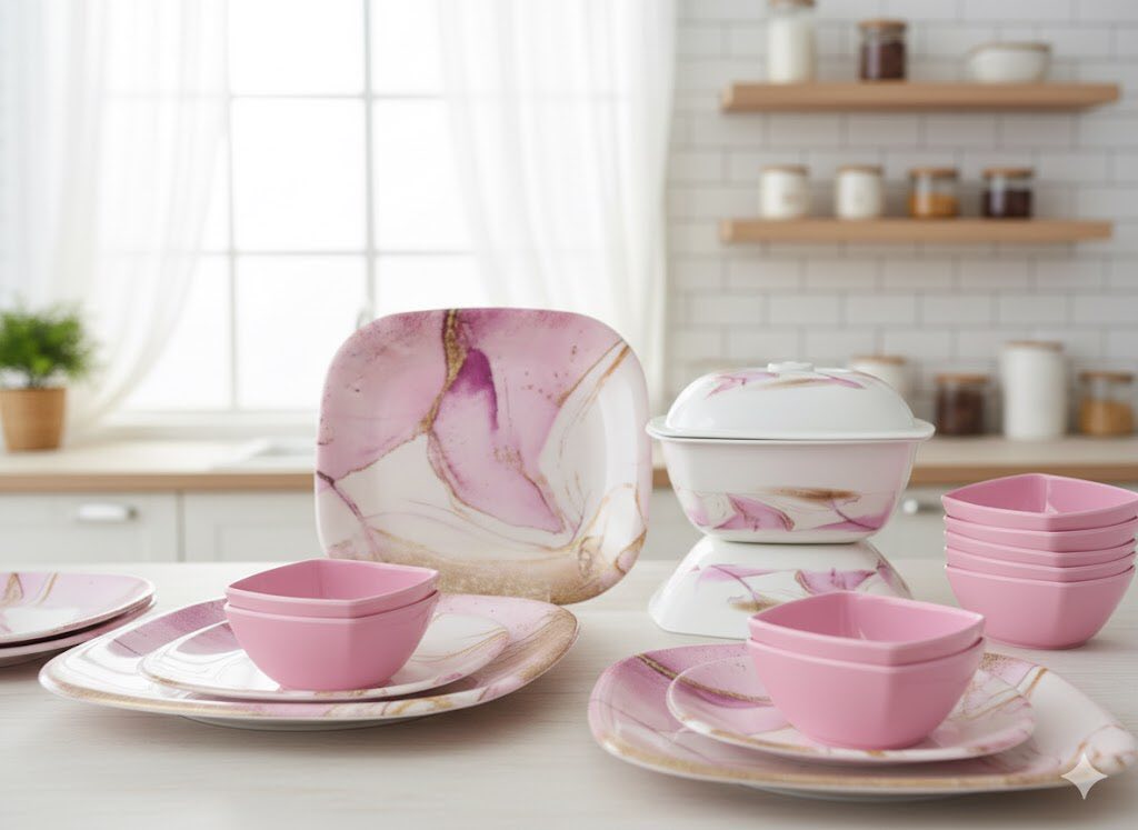 أما قسم السفرة والتقديم، فمليان أطقم أطباق بورسلين وزجاج بألوان ونقوش راقية تناسب المودرن والكلاسيك، وكاسات عصير وفناجين شاي وقهوة، وصواني تقديم وأباريق أنيقة بتكمّل شكل السفرة وتخلي الضيافة دايمًا جاهزة بشكل شيك وعملي.