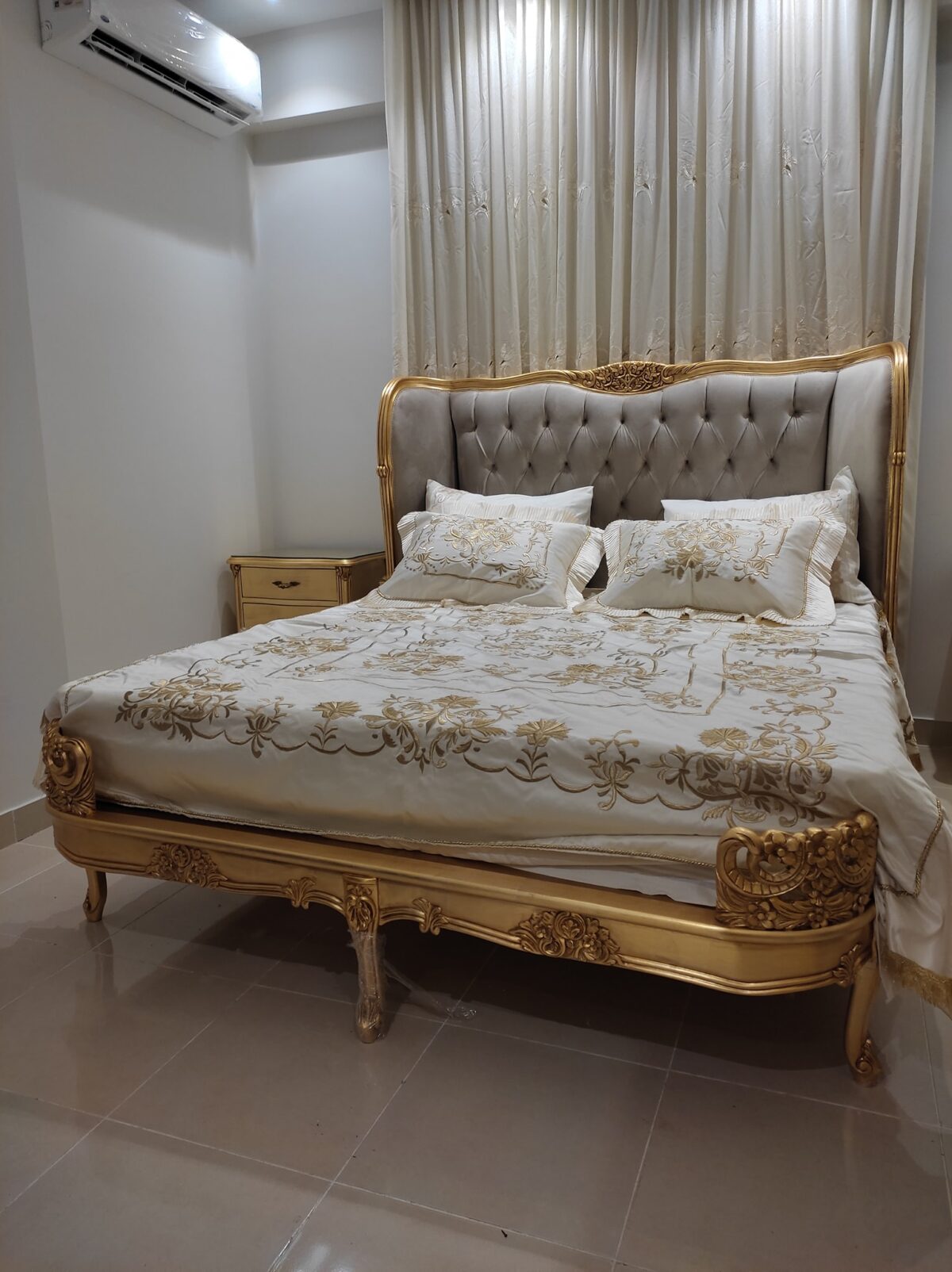 - السرير: رأس مرتفع منجد بخيوط متوازية (Channel Stitch) أو بتطريز زخرفي راقٍ، وإطار خشبي متين.