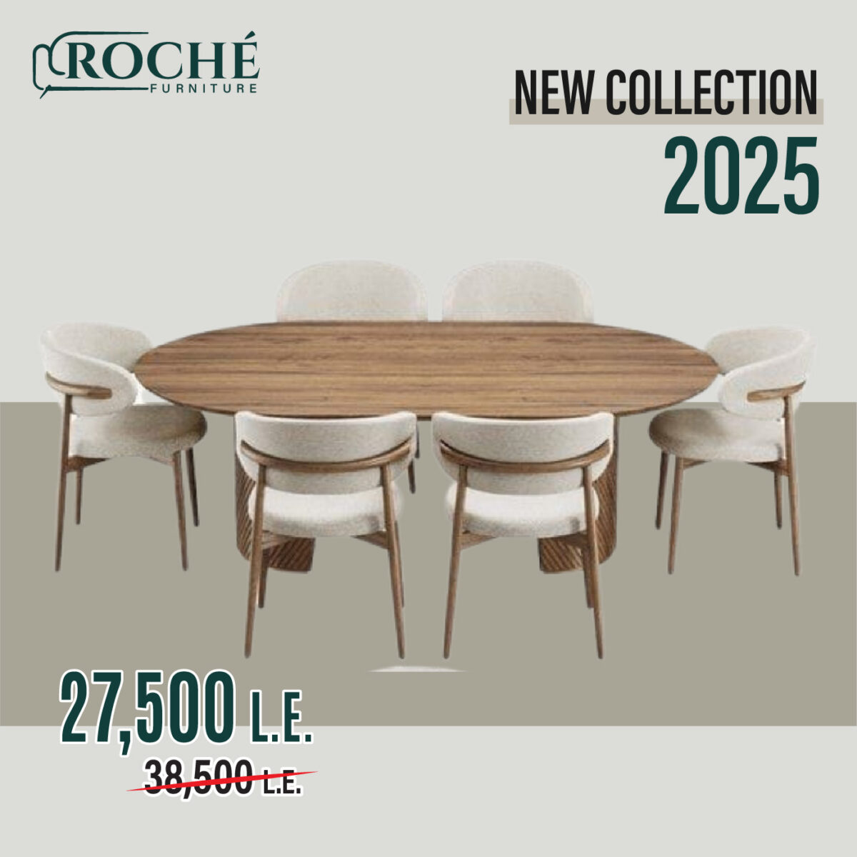 السفرة في Roche Furniture مصممة علشان تكون قطعة ديكور في نفسها. الطاولات بتكون شكلها شيك بخامات زي الخشب المطفي أو السطح الرخامي الصناعي، والكراسي مريحة وبتكمل شكل السفرة العام من غير أي مبالغة.