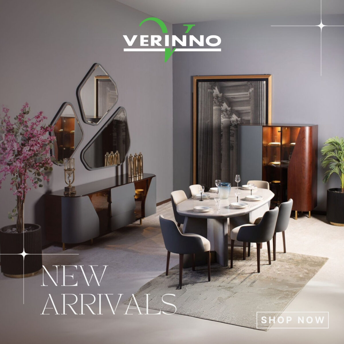 Verinno بيميل للأسلوب المودرن المعاصر مع لمسة فنّيّة هنا وهناك. الخطوط عندهم نضيفة وواضحة، لكن بيضفوا لمسات غير متوقعة زي تفاصيل هندسية بسيطة أو خلط خامات بين معدن وخشب ورخام. الألوان الأساسية بتكون محايدة – رمادي، أبيض، أسود، وخشب فاتح – مع إمكانية طلب لمسة لون جريء زي أخضر زيتوني أو كحلي.
